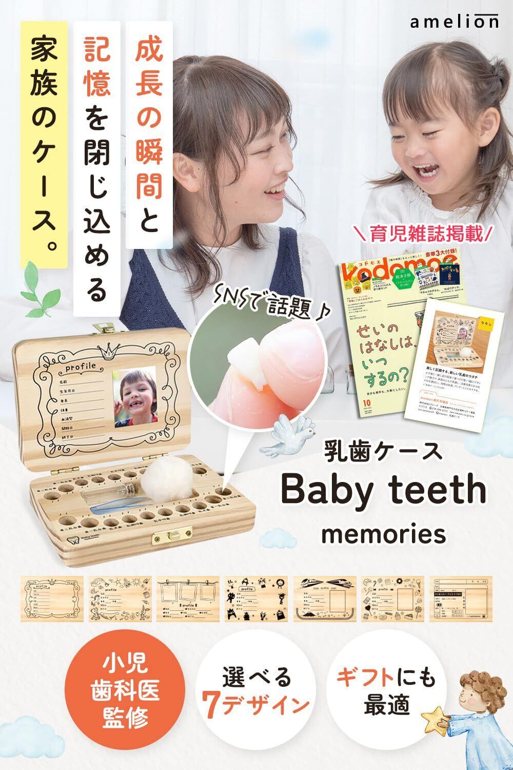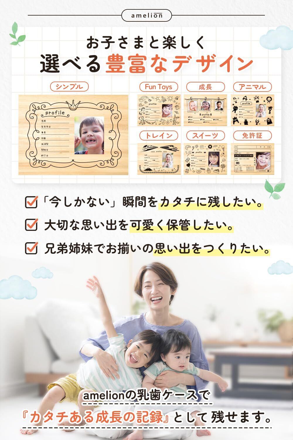 【デザインは4種類】 <免許証風> 身分証明の代表的なものでもあるお馴染みの免許証。そんなデザインを乳歯ケースに採用。役所的な硬いデザインとお子様のかわいさのギャップが楽しいデザインです。 <シンプル> 男女問わず使えるやわらかいシンプルなデザイン。ギフトなどで好みがわからないときにも役立つ間違いのないデザインです。 <成長>3つの写真が貼れるのが特徴のデザインです。左から乳歯が初めて生えた写真、乳歯が抜け始めた写真、成人になったときの写真 という風に、お子様の成長を記録するのにぴったりです。 <Toys Fun>見ているだけで楽しくなるような、成長した時にまた思い出せるようにデザインをしました。