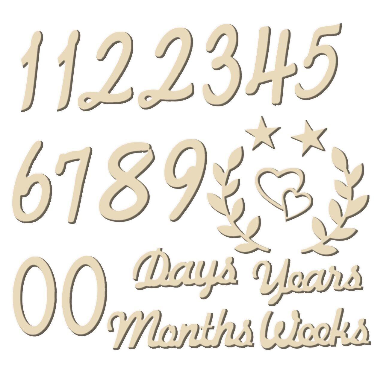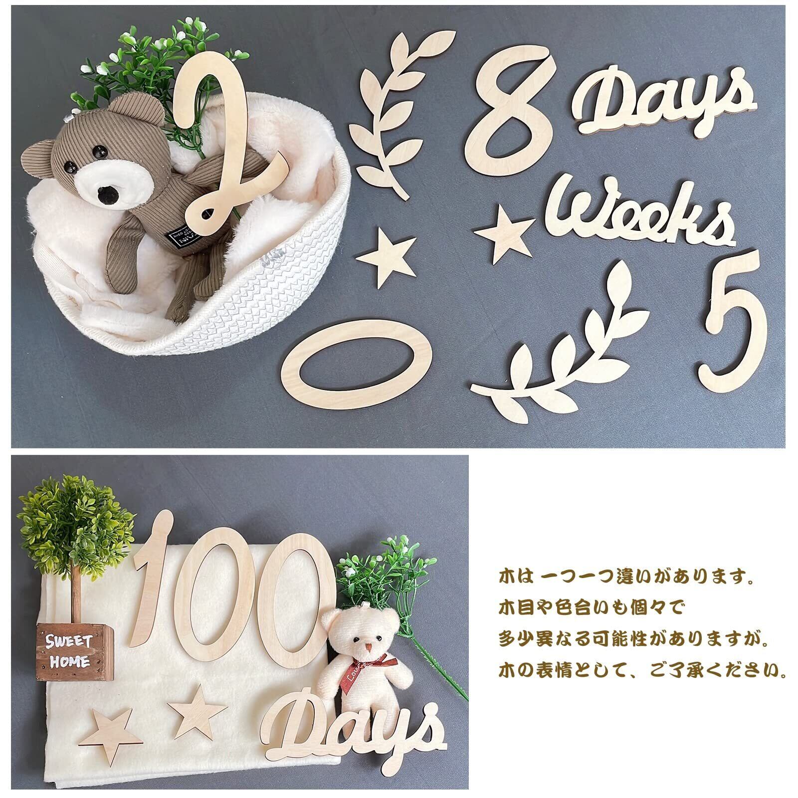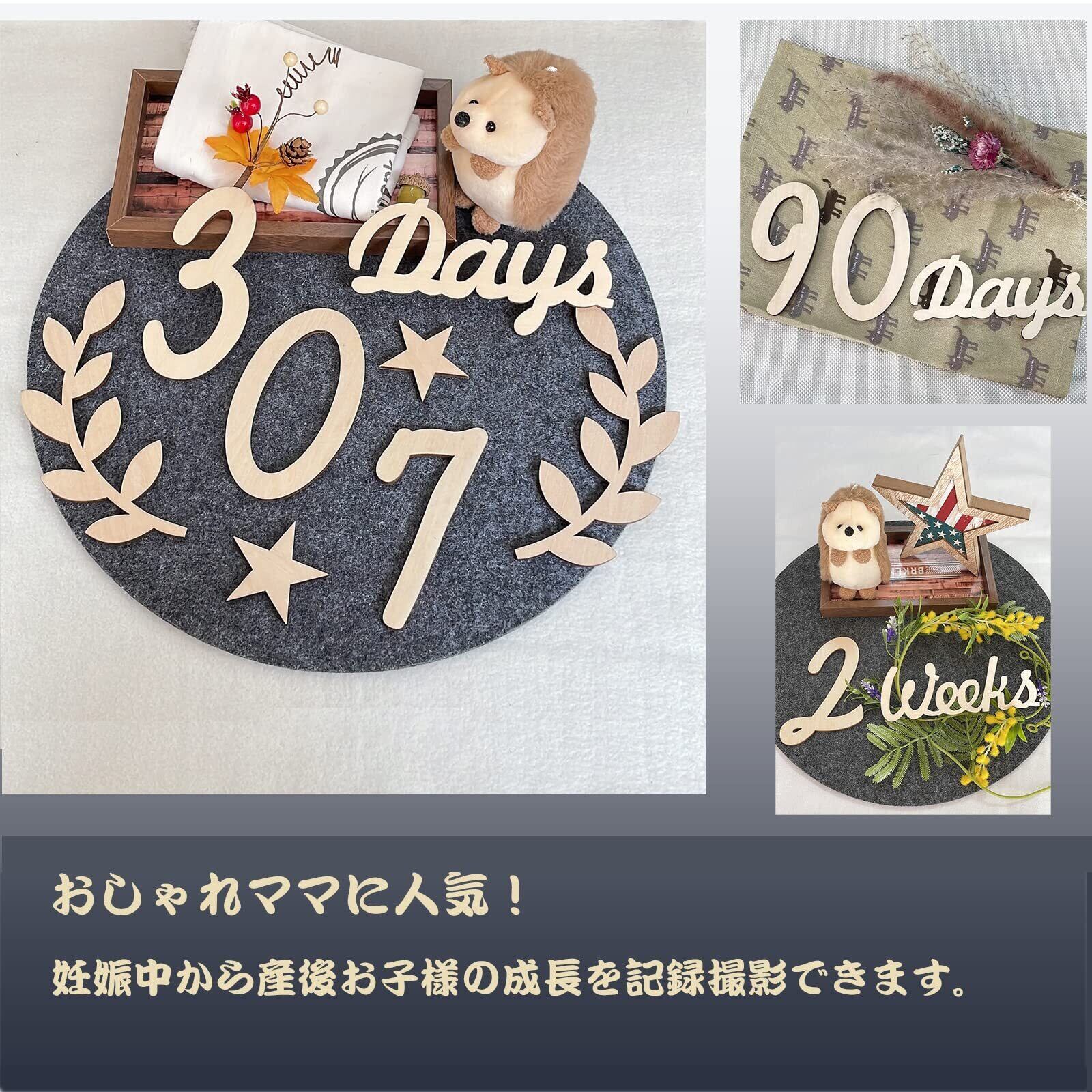 【セット内容】0-9の数字(0*2個、1*2個、2*2個)、また「day(s)、week(s)、month(s)、飾りの葉」などがあります。
