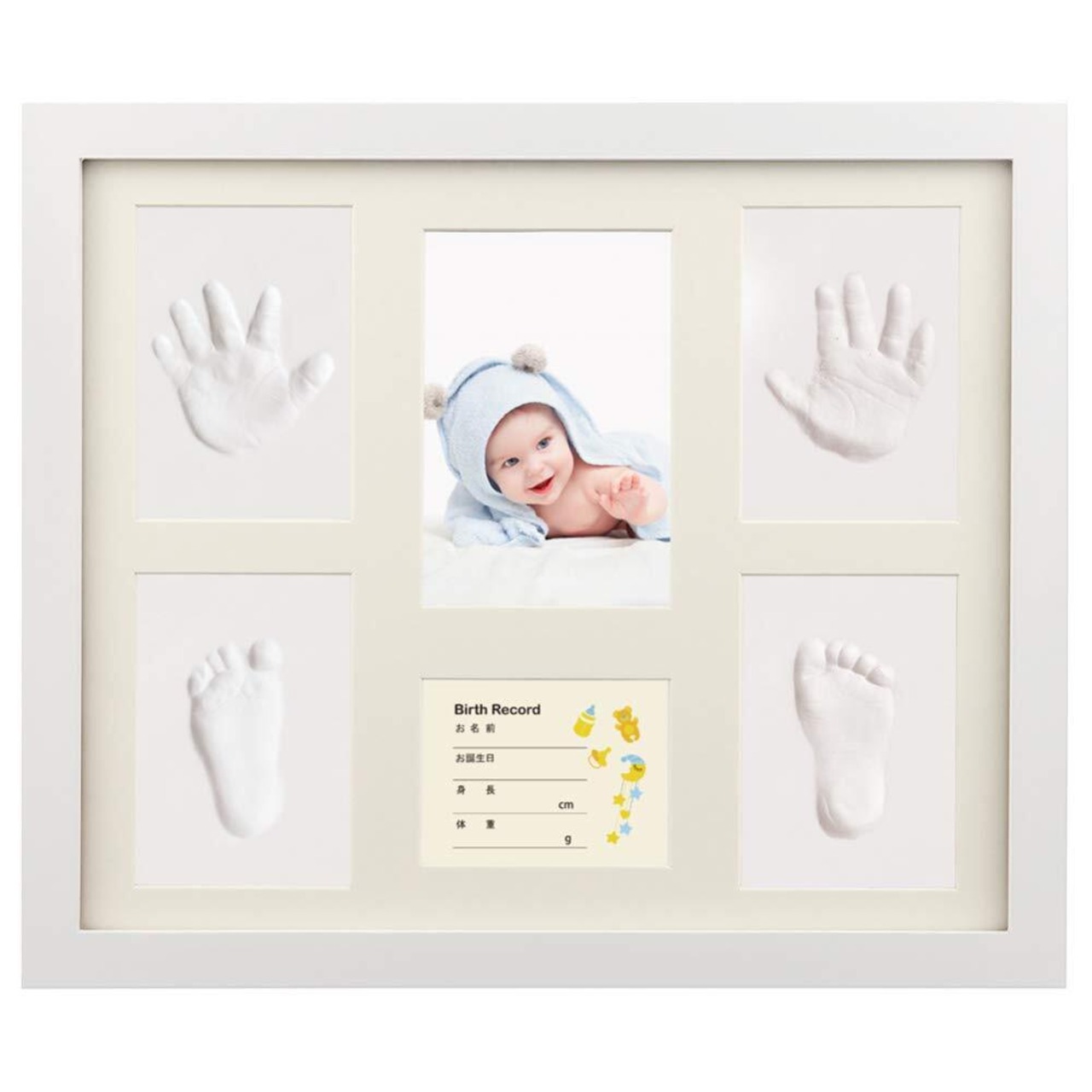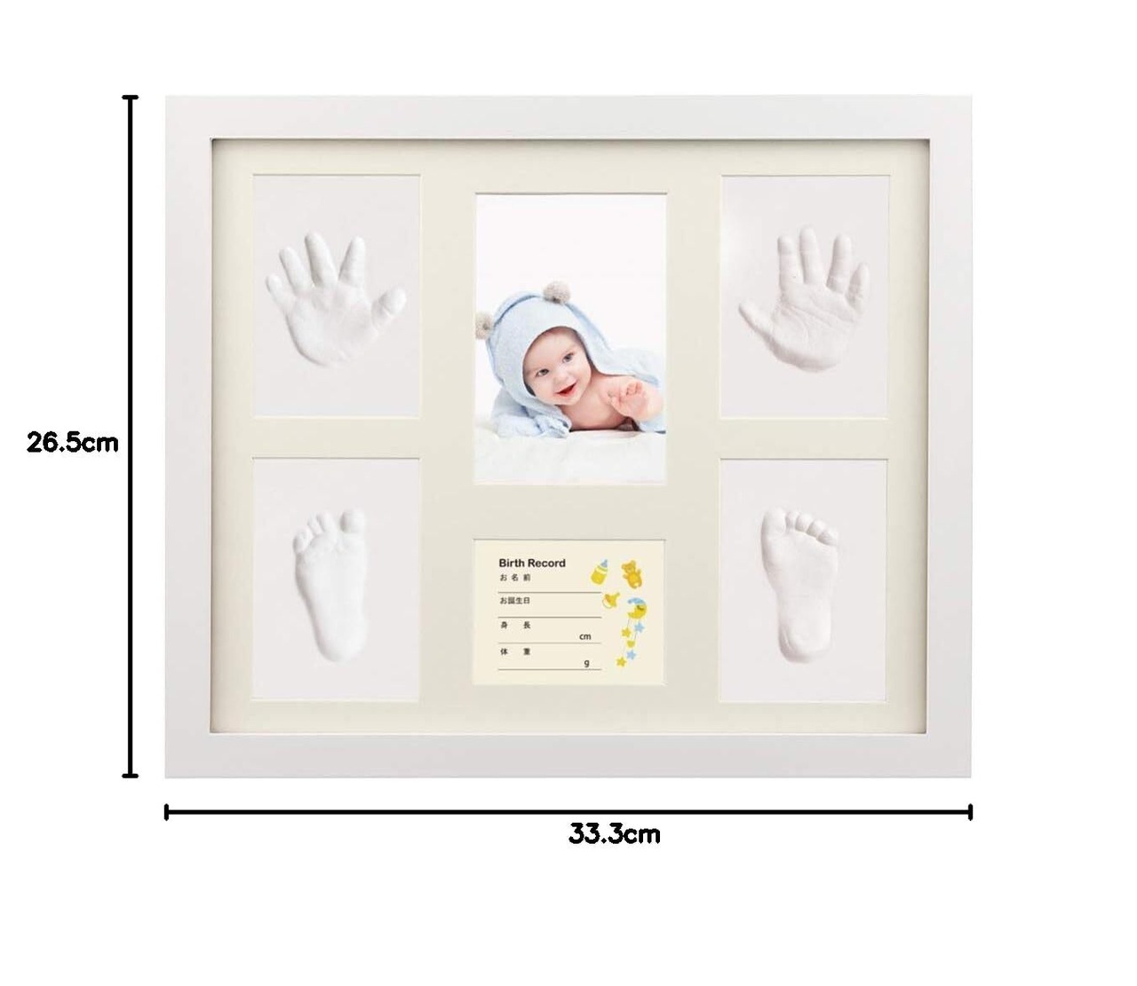ボリューム感のあるギフト:手形・足形用に4つのスペースが用意されて、お名前・誕生日・身長・体重・血液型の記録が、赤ちゃんの写真をやさしく囲むようにデザインされています。赤ちゃんに深い愛を注いでくれます。フレームの内側は0.8cmの厚さとなっており、付属のビーズで装飾することもできるようになっています。