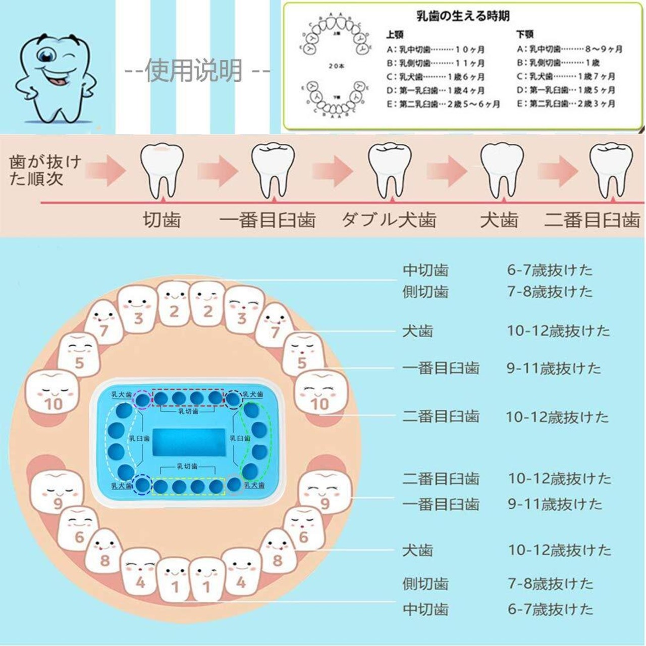 2.【すべての乳歯を丸ごと収納】:抜けていく子供の歯を、上下すべて収納できる乳歯ケースです。対応する穴に1本ずつ収納していく形式になるので、すべて収納すると、コレクションケースのように完璧な収納ができます。