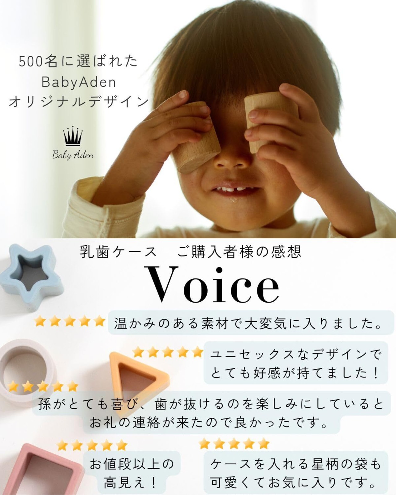 歯列と同じ並びで乳歯を1つ1つ収納できます。抜けた歯とまだ抜けていない歯が分かりやすく、親子で一緒に成長の記録を楽しむ事ができます。