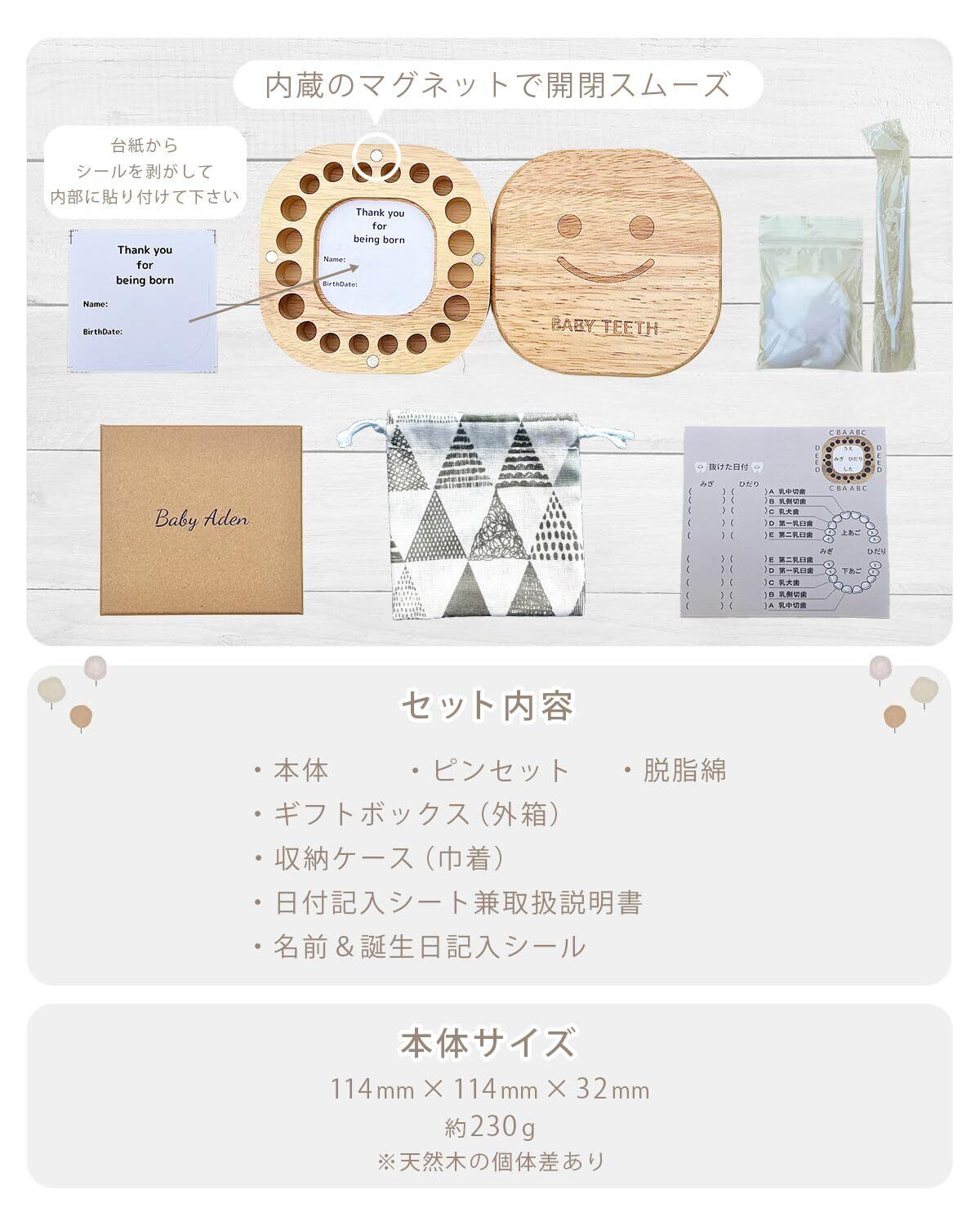 【セット内容】乳歯ケース本体 / ツリー柄の巾着収納ケース / ギフトボックス / 名前&誕生日記入シール / 日付記入シート兼取扱説明書 / ピンセット / 脱脂綿