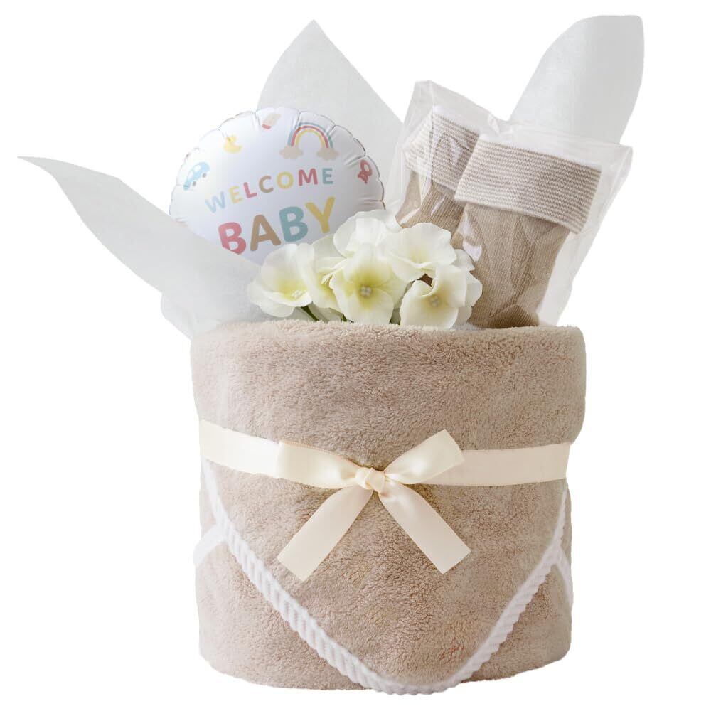 【もらって嬉しいループとタオルベビー靴下のおむつケーキ】出産祝いとして人気の「紙おむつ」「タオル」「ベビーソックス」がセットになった、”もらって嬉しい”おむつケーキです。飾って楽しんだ後も普段使いができて実用性も抜群。ママとベビーに嬉しいおむつケーキです。