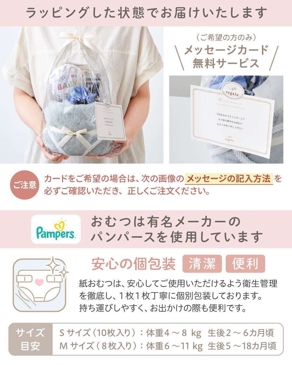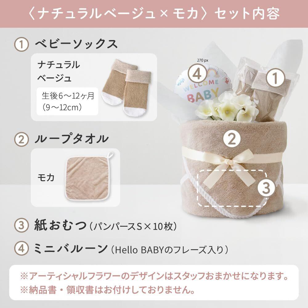 regalo bel おむつケーキ 出産祝い メッセージカード付き ベビーソックス タオル 女の子 男の子 ギフトセット ベビー ギフト プポン (ナチュラルベージュ×モカ, パンパースS)