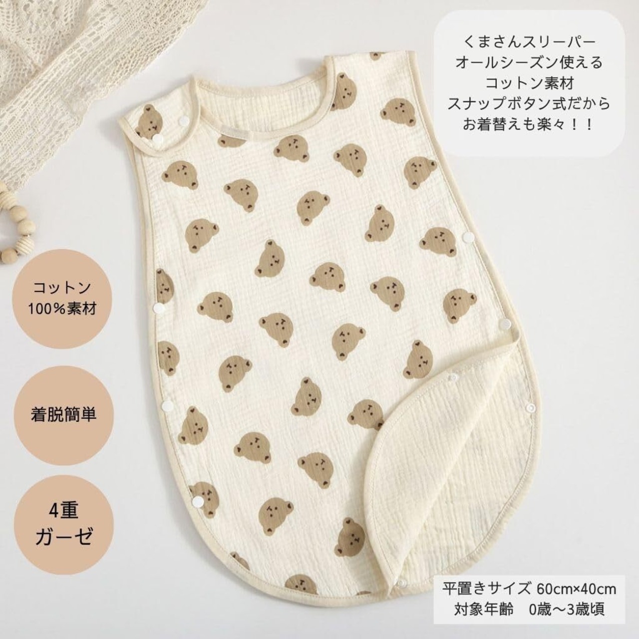 【赤ちゃんに優しいふわふわなコットン100%の四重ガーゼ】お肌に優しい綿100%の四重ガーゼを使用しており、柔らかくて軽いので赤ちゃんの肌に優しくストレスフリーで快適にお使いいただけます。デリケート肌の赤ちゃんや敏感肌の方にも安心してお使いいただけます。