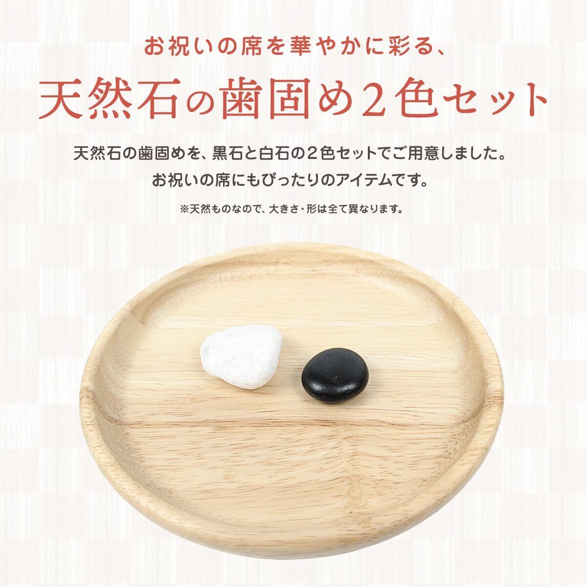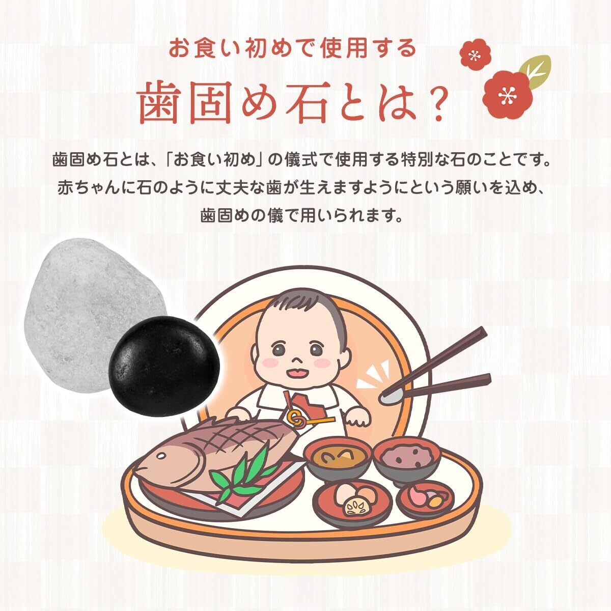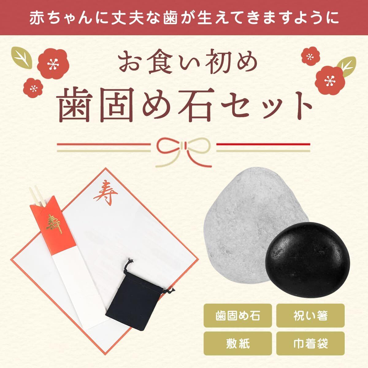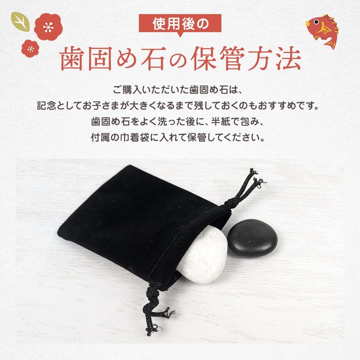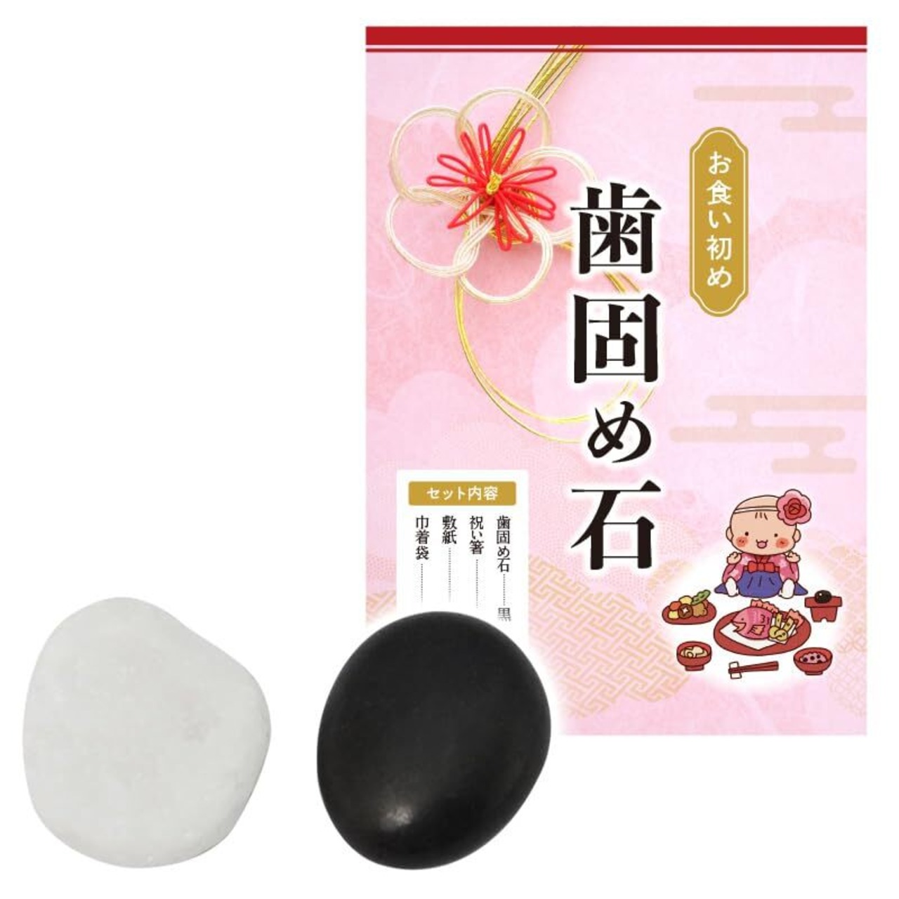 セット内容:歯固め石 白・黒各1個、巾着、祝箸、敷紙