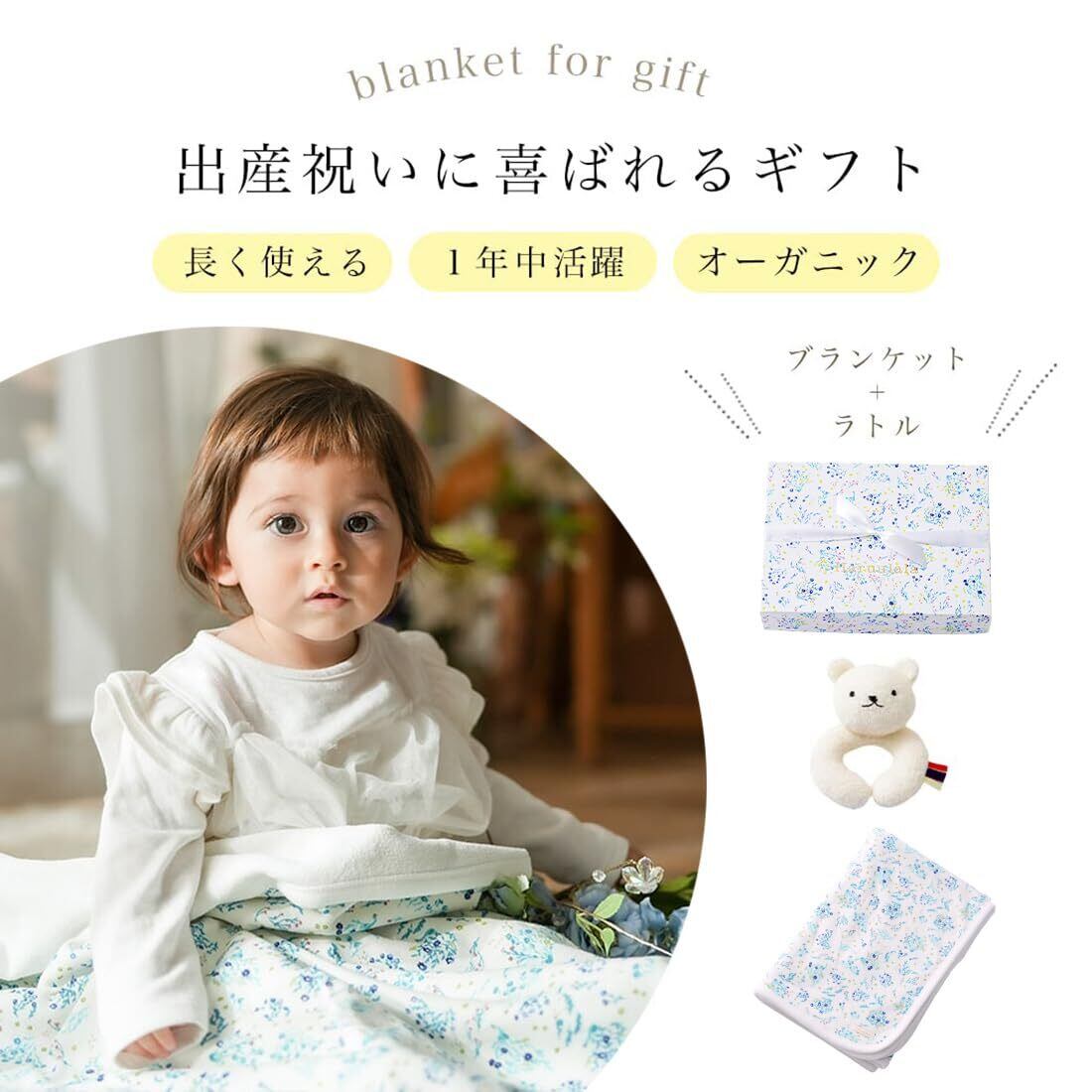 ハルウララ 出産祝い 女の子 男の子 オーガニックコットン ブランケット (ブランケット +ラトル+ギフトボックス) 0歳〜3歳 (ヒカリエ)