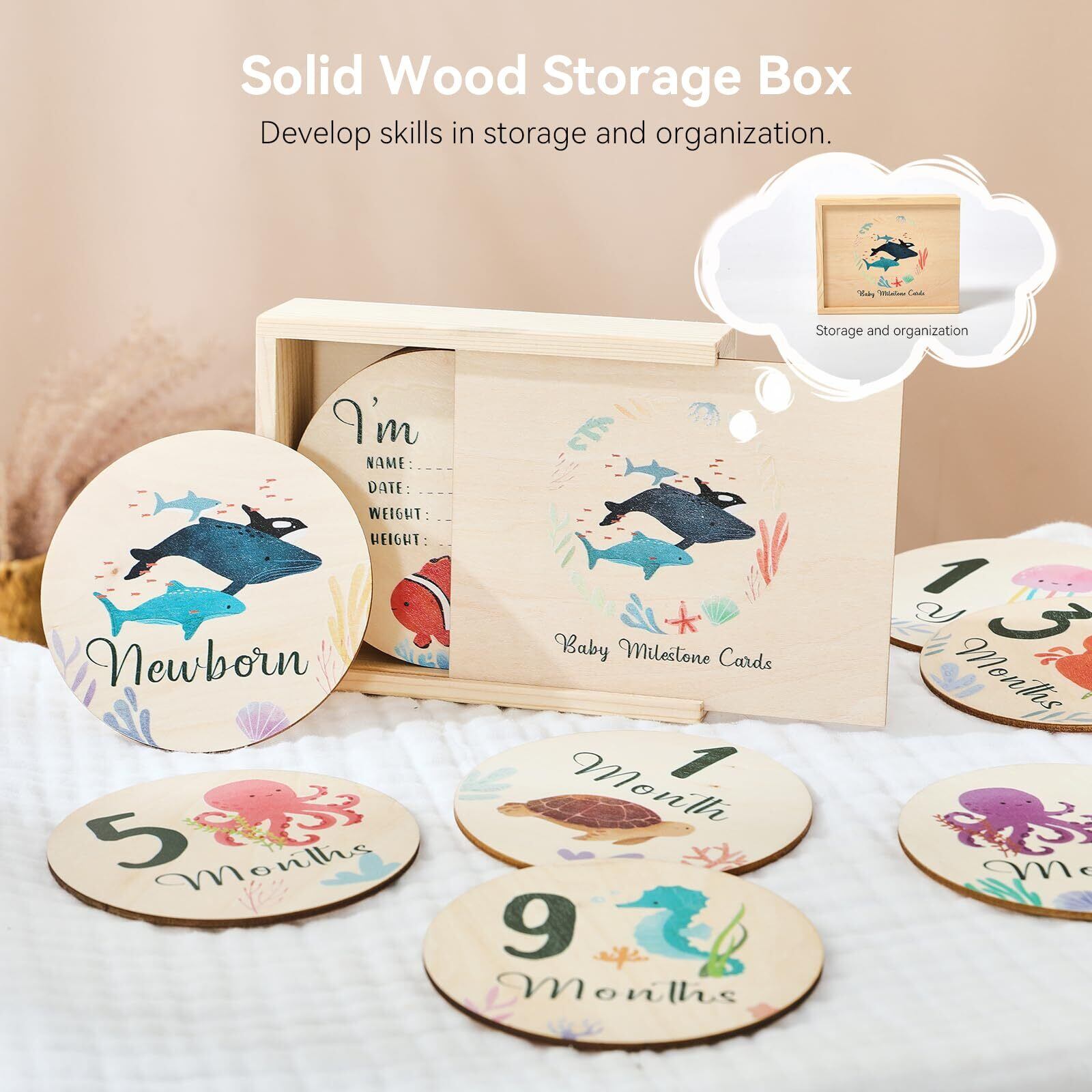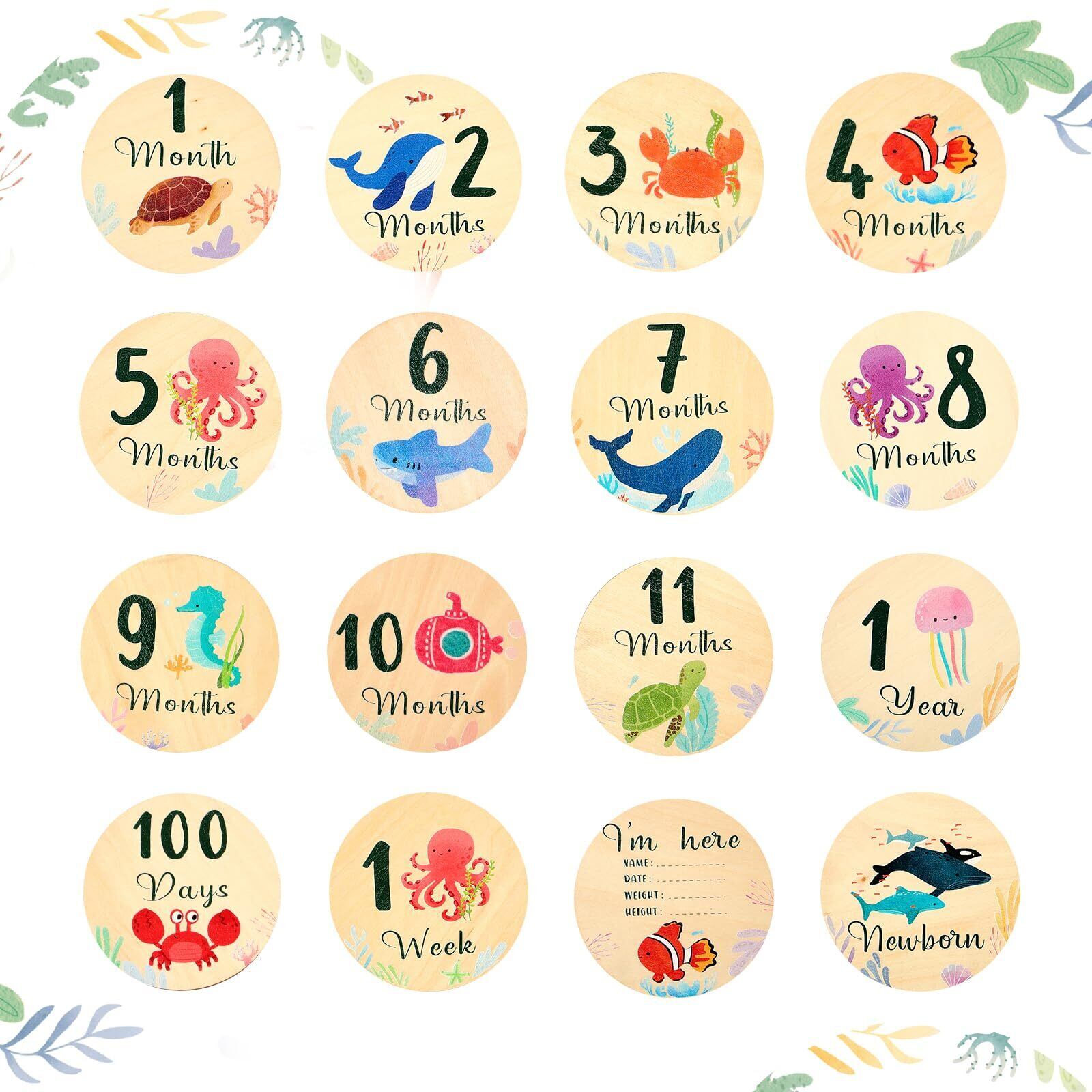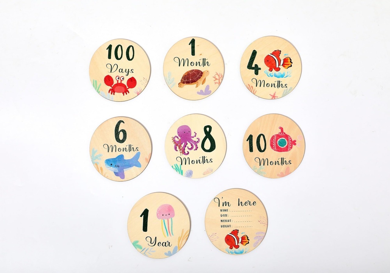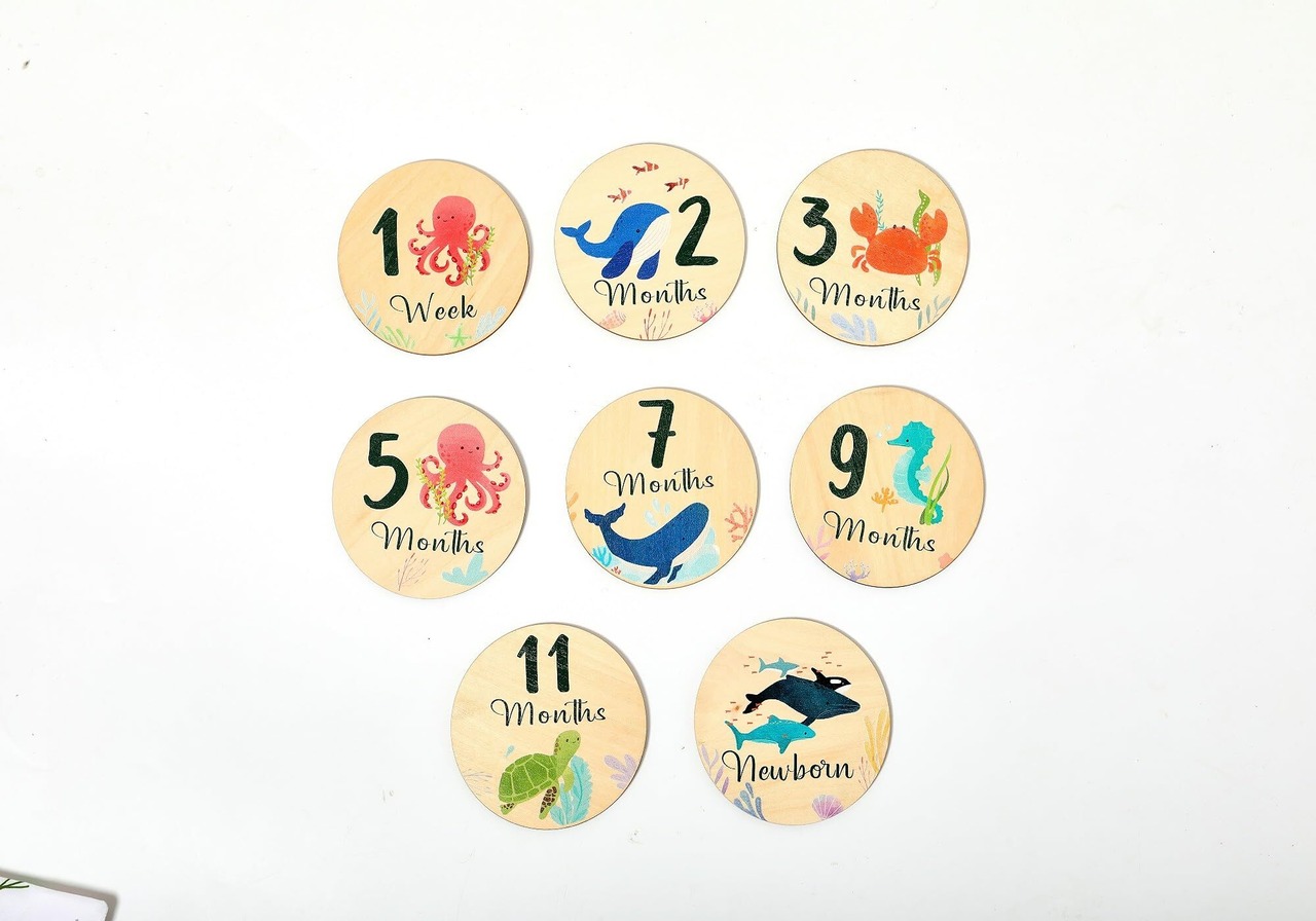 Promise Babe 月齢フォト ベビーマンスリーカード 8枚セット 海洋動物 ウッド 天然木材 ニューボーンフォト 写真道具 成長記録 新生児 赤ちゃん 出産祝い 収納箱なし