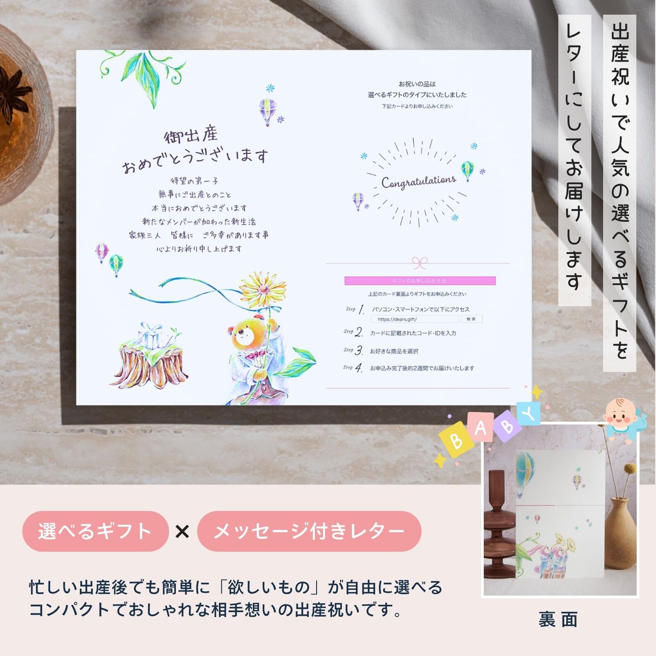 化粧封筒、メッセージカード、選べるギフトカードの出産祝いのフルセットだから、お届け状態のままで出産のお祝いがプレゼントできます。