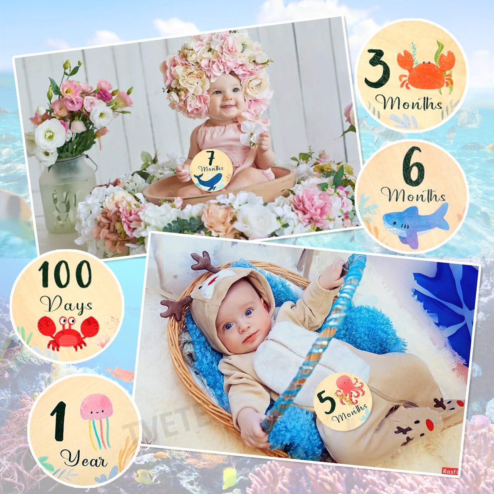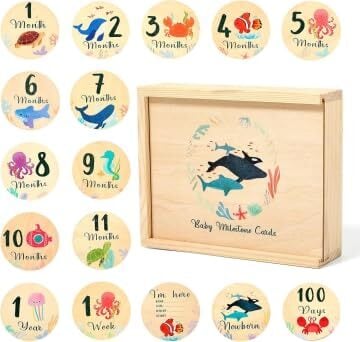 【セット内容】8枚のかわいい海洋動物柄の月齢カードを含む月齢フォトグッズセット。木製の収納箱付きで、ニューボーンフォト セットとしてすぐに使えます。