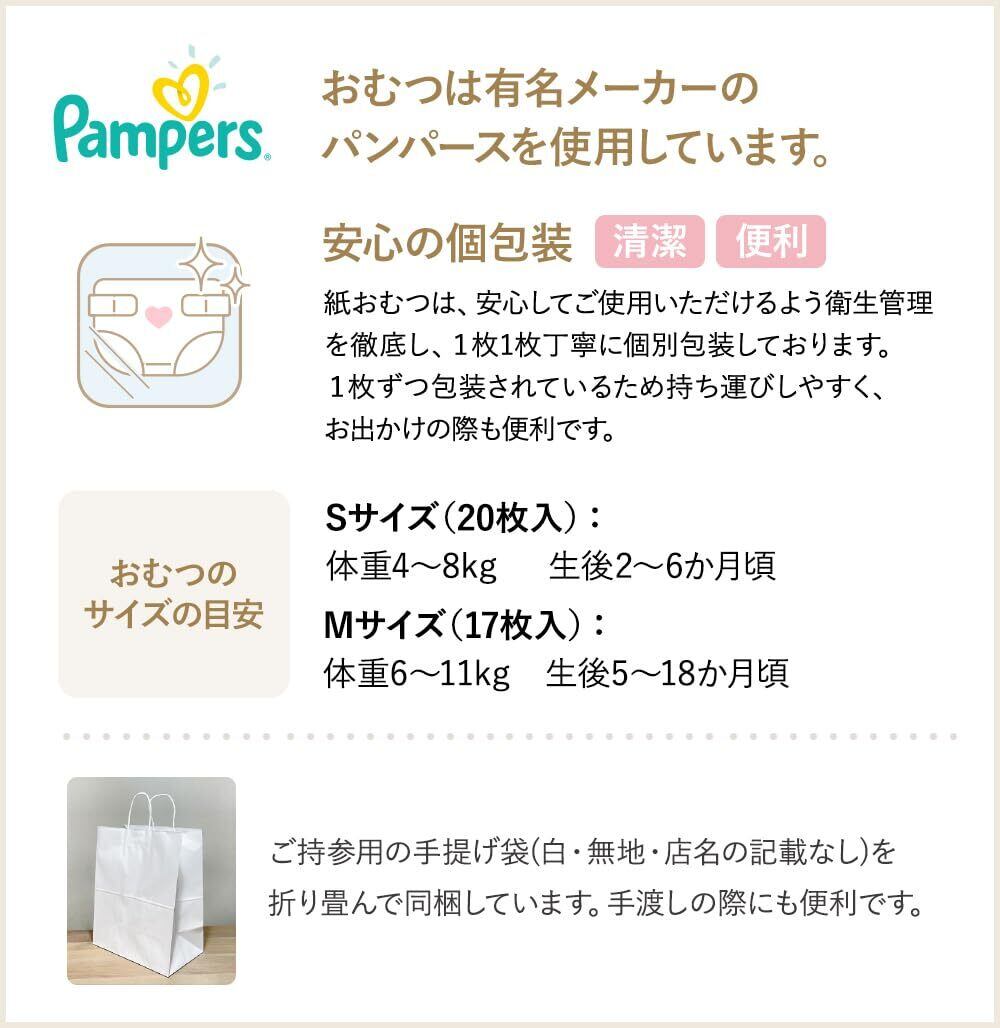 【おむつケーキのサイズ】幅約26cm×高さ約30cm【ラッピングサイズ】幅約35cm×高さ約30cm 【おむつの種類】パンパース【おむつのサイズ】S(体重4~8kg)14枚、M(体重5~18kg)12枚