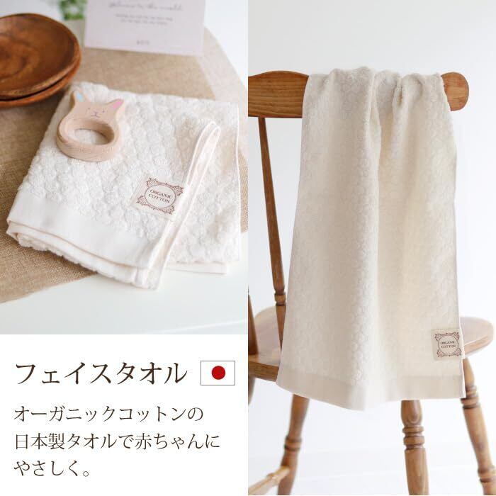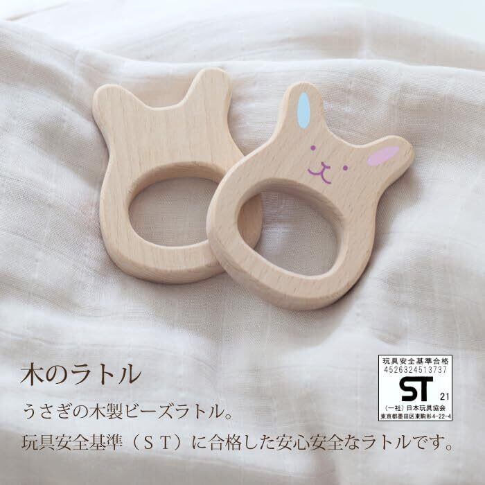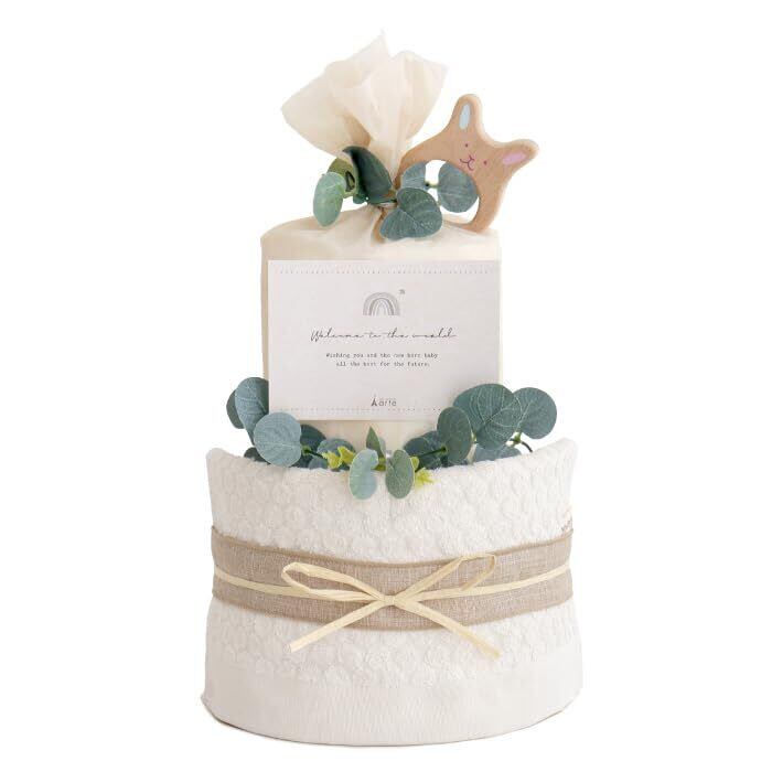 木のぬくもりを感じられるうさぎのビーズラトルと日本製のオーガニックフェイスタオルで、やさしい気持ちになれるおむつケーキです。