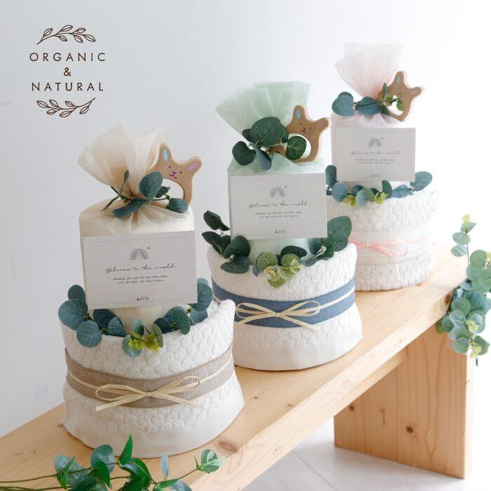 オーガニックにこだわっておむつもオーガニック素材を使用した赤ちゃんに安心安全なおむつケーキ。