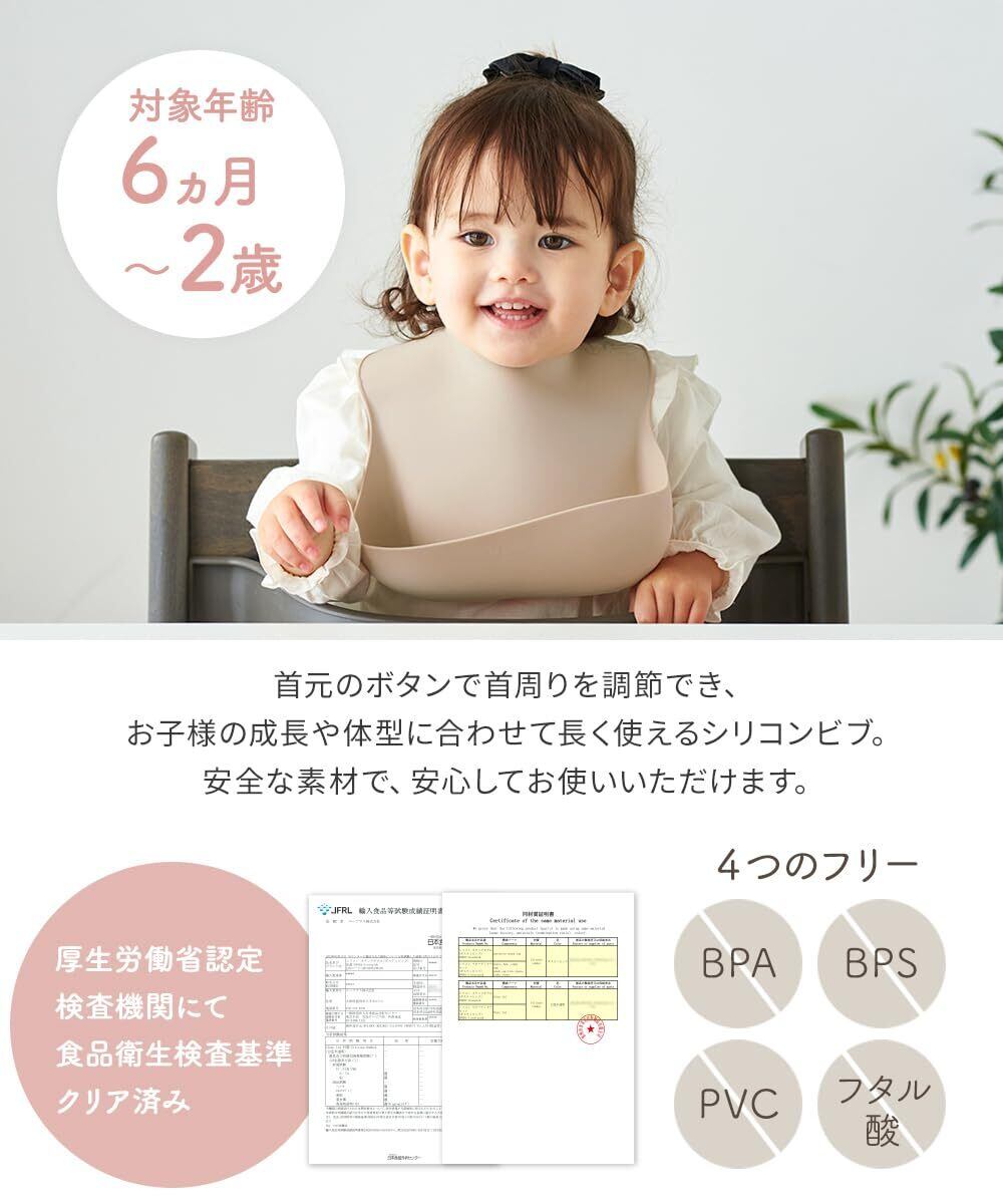 シリコンビブの素材は、厚生労働省認定検査機関にて食品衛生検査基準をクリアした安全なシリコンを使用しています(BPA/BPS/PVC/フタル酸不使用)