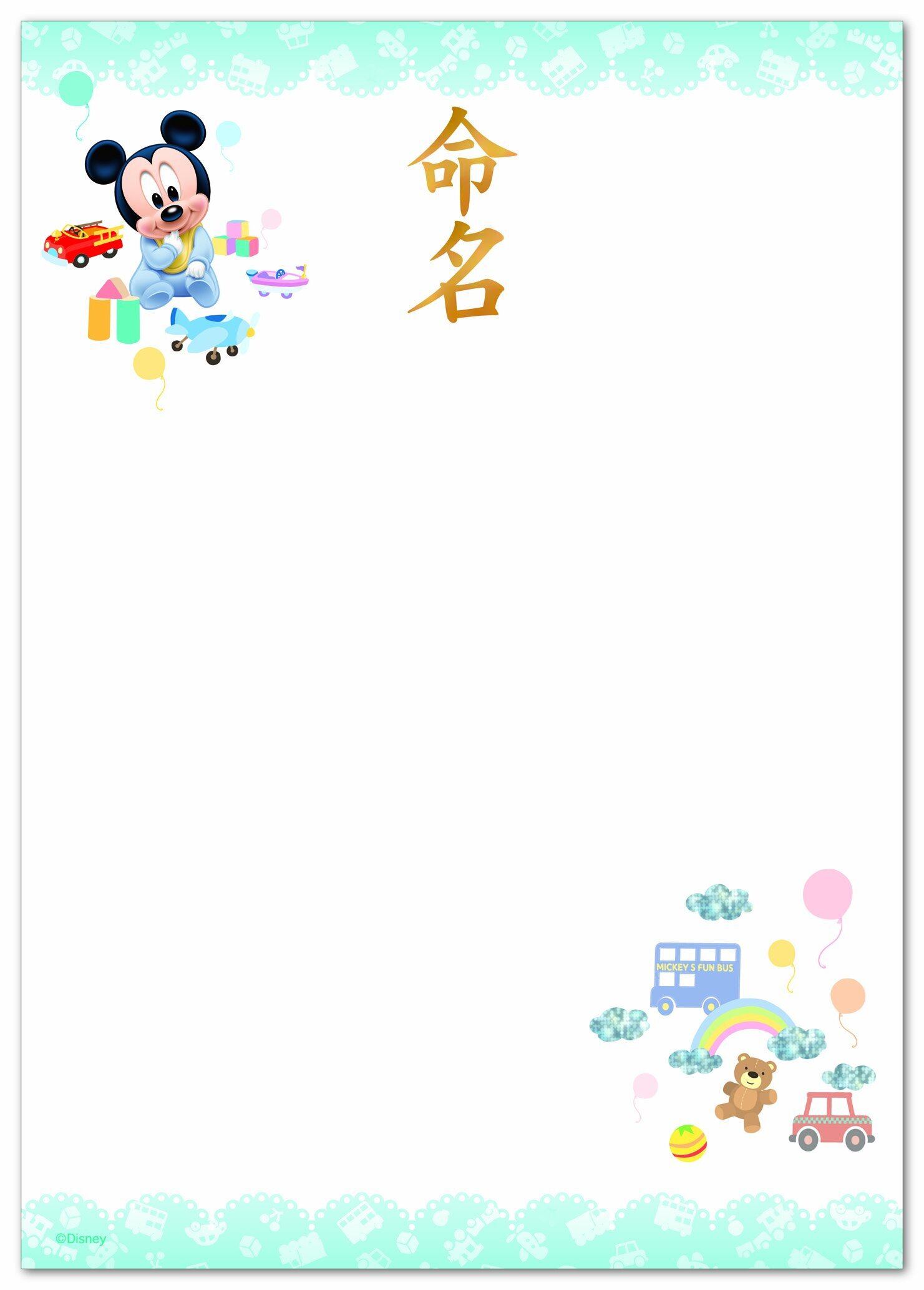 人気のベビーミッキーの命名用紙です。A4サイズで、あらゆるインクジェットプリンタに対応。