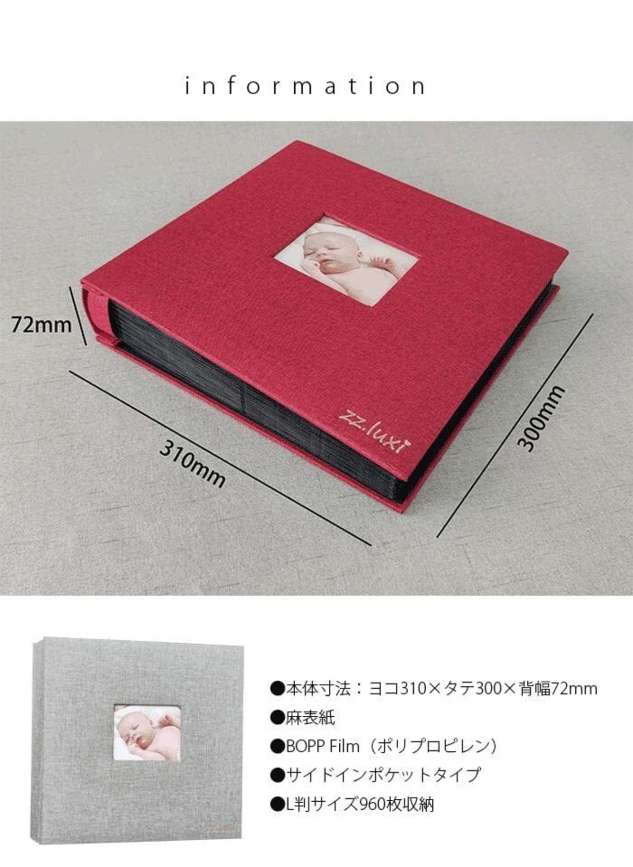 素材:麻表紙+ポリプロピレン、シンプルなデザインで、耐久性も抜群です. ●表紙のフレーム部分にお気に入りの写真を入れて、お部屋のインテリアとして棚に飾るのもオススメ。時期やシーン別でアルバムを分けていれば、一目で内容もわかりやすくなります。お子様が成長するにつれ、フレームが変わっていくのを見るのも楽しみになります。