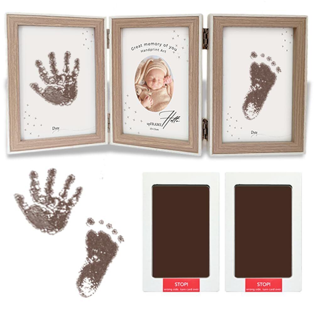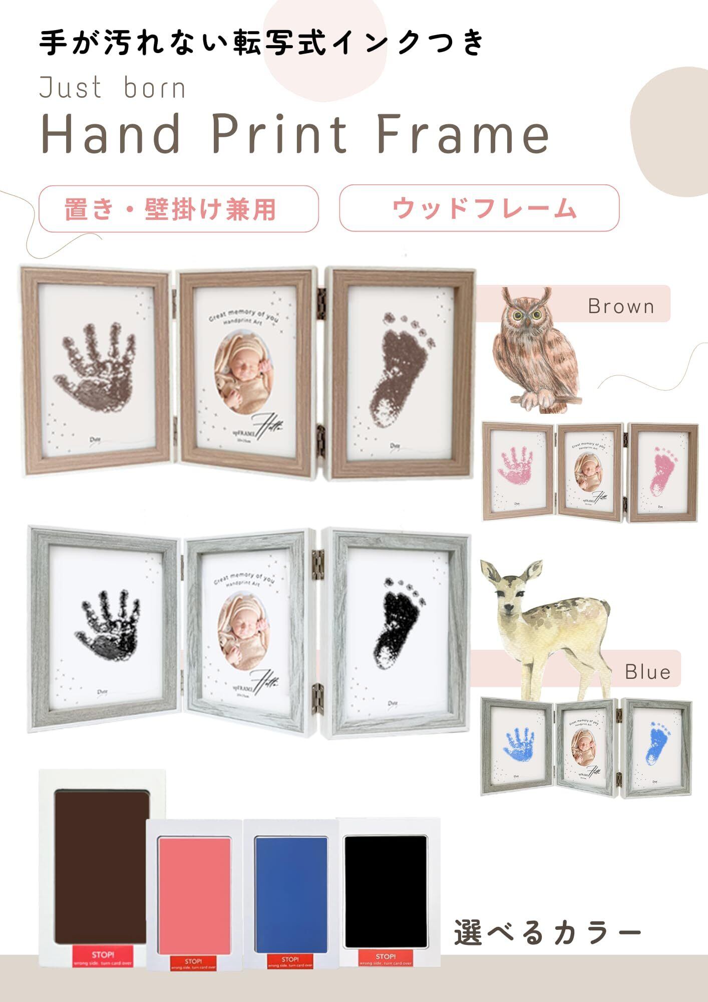 かわいい!手形足形スタンプ とウッドフレームのセット: 赤ちゃんの手形や足形を記念に残せるおしゃれな 写真立て です。木製三連の高級感あるフレームがシンプルおしゃれ。インクパッド式で簡単、そしてなんといっても素敵なカラーが選べることが特徴です ピンク ブルー ブラック ブラウン ウッドフレームとの組み合わせが素敵でナチュラルに仕上がり、とてもかわいいのでおすすめです。
