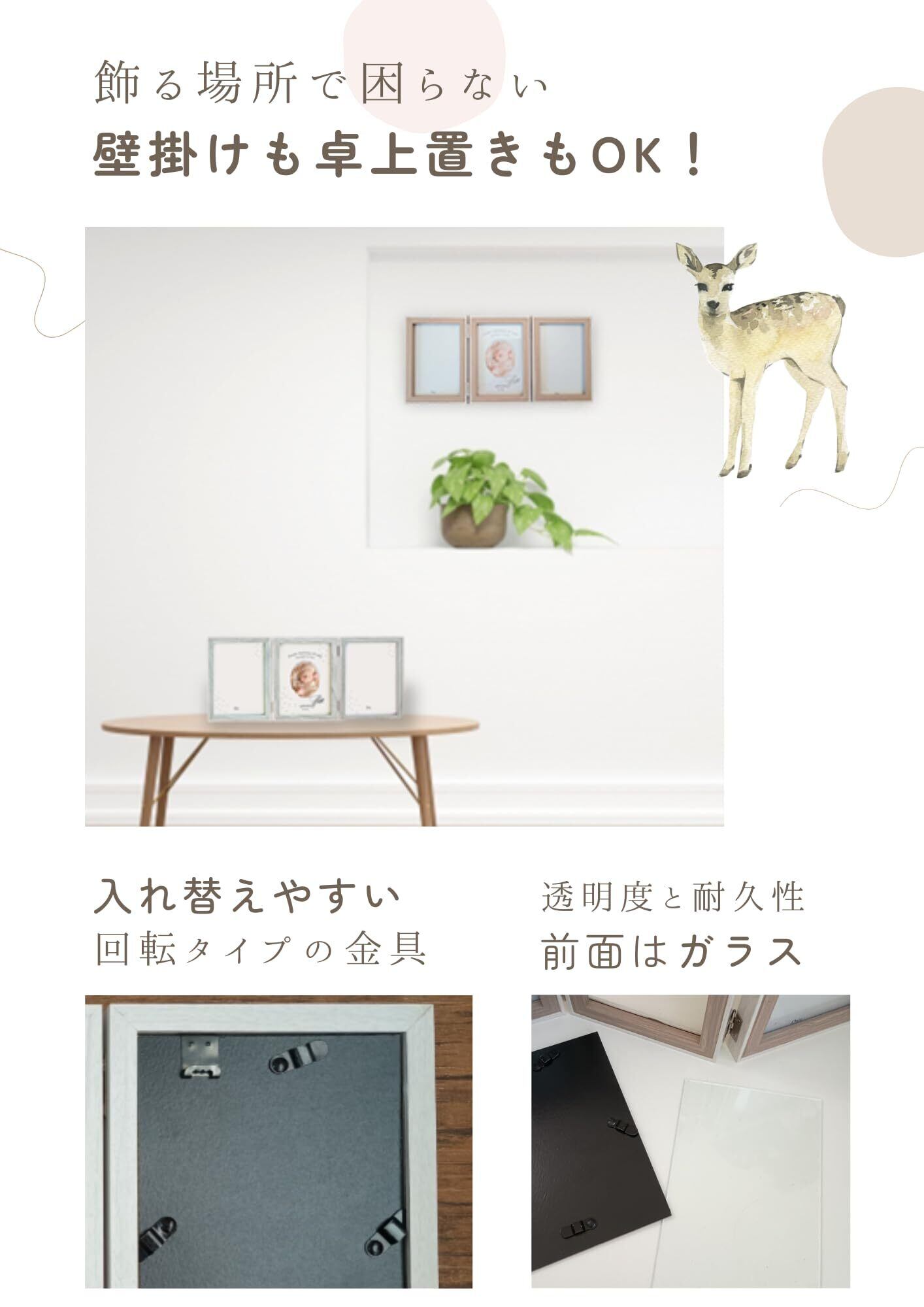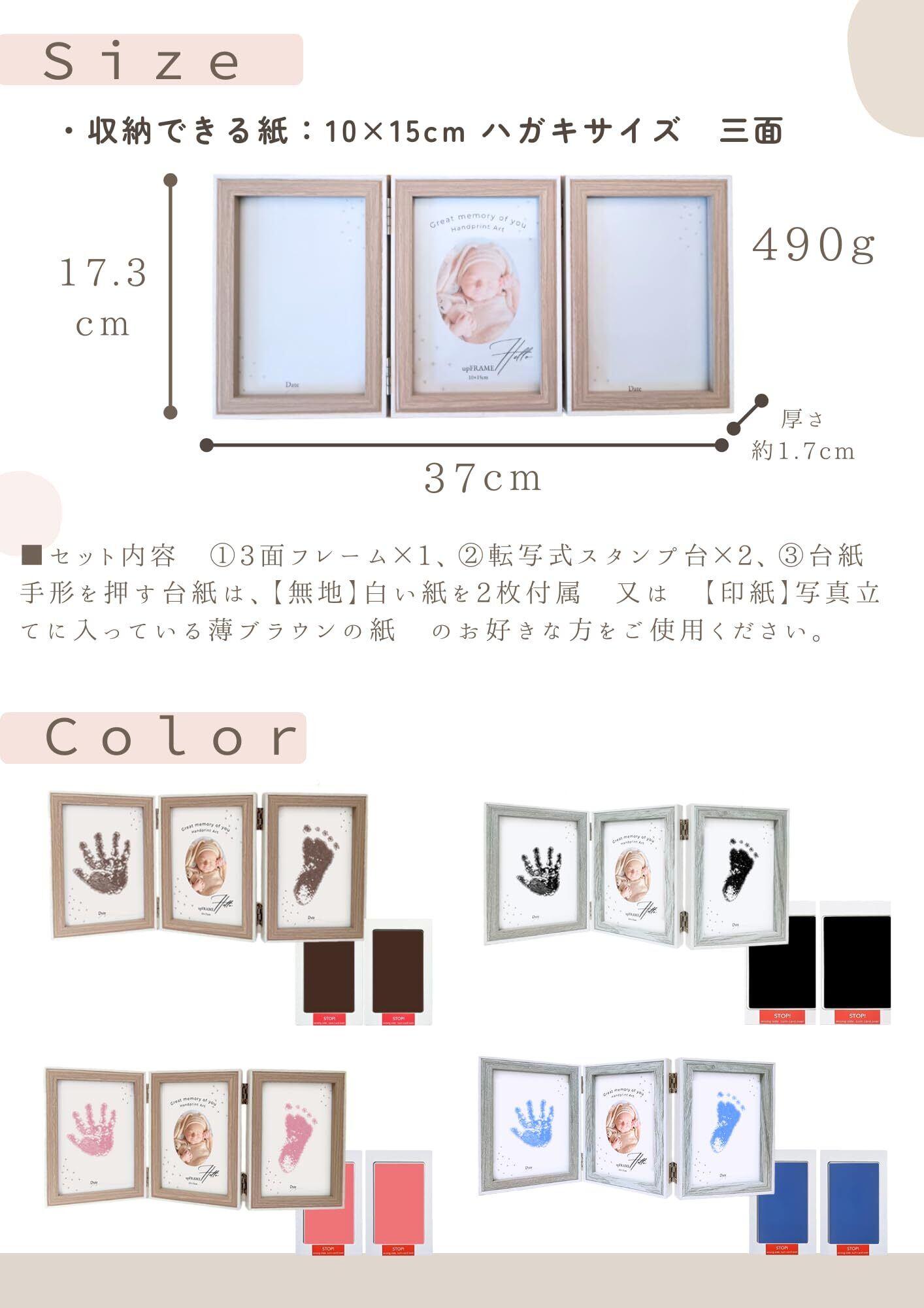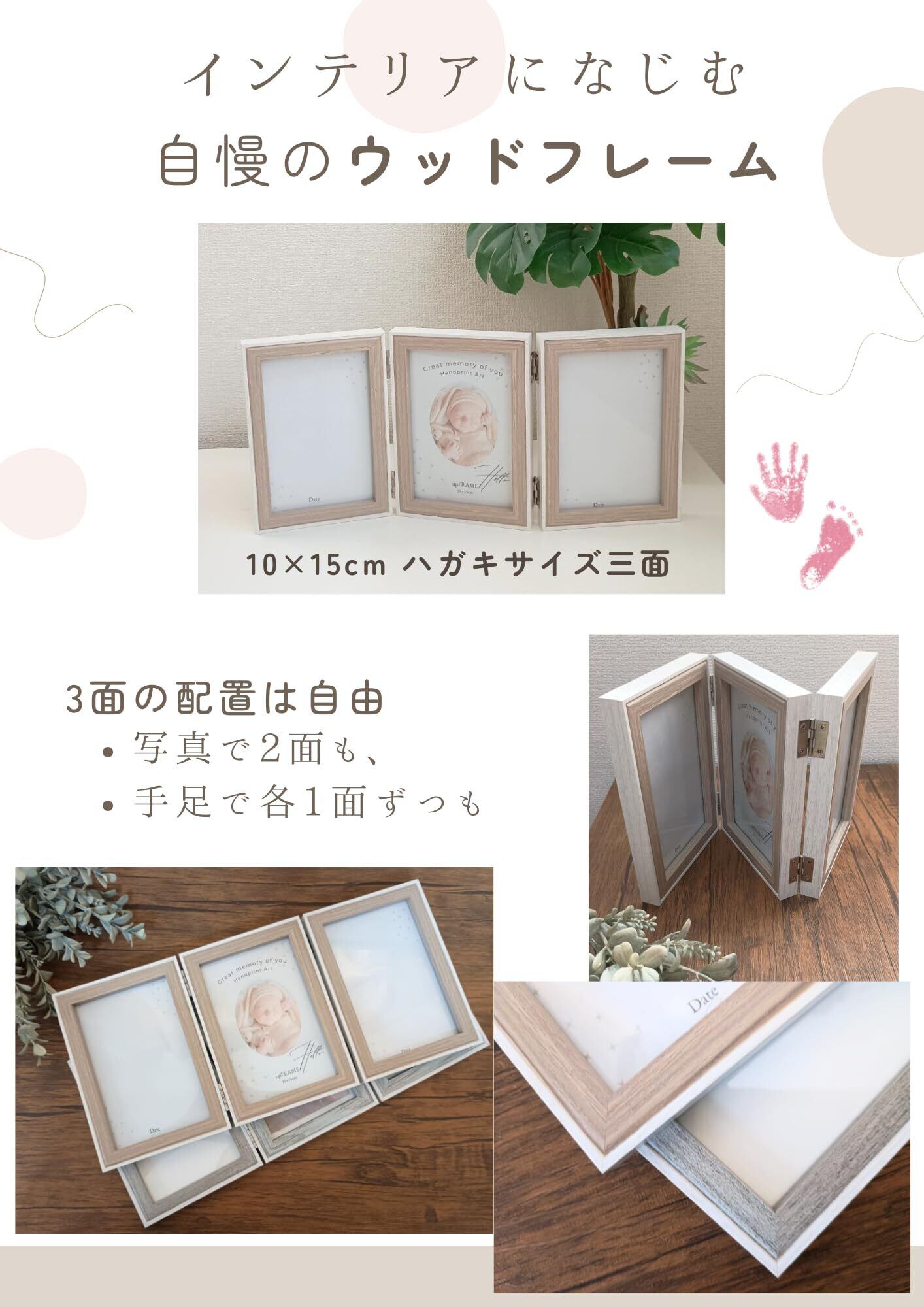 三面のフレームは写真を2枚にするもよし、写真を1枚で手形足形を2面使用するもよし。お好みや手の大きさに応じてご使用ください。出産祝い にもおすすめです
