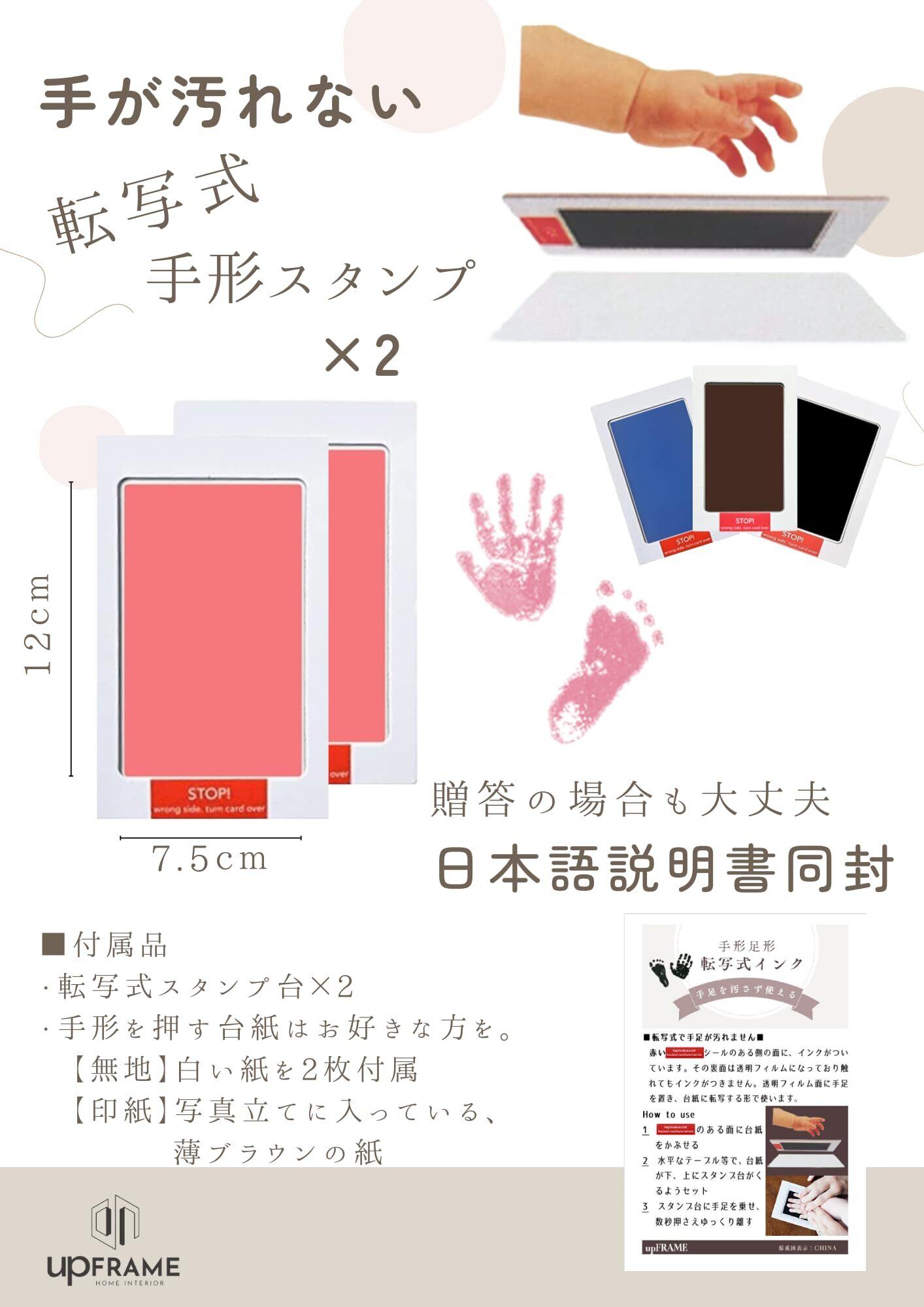 手が汚れないインクパッド(2枚): 赤ちゃんの手足を汚さずに手形足形を作れる、安全で簡単に使えるインクパッドが付属しています。使い方は簡単で、説明書も同封しています。
