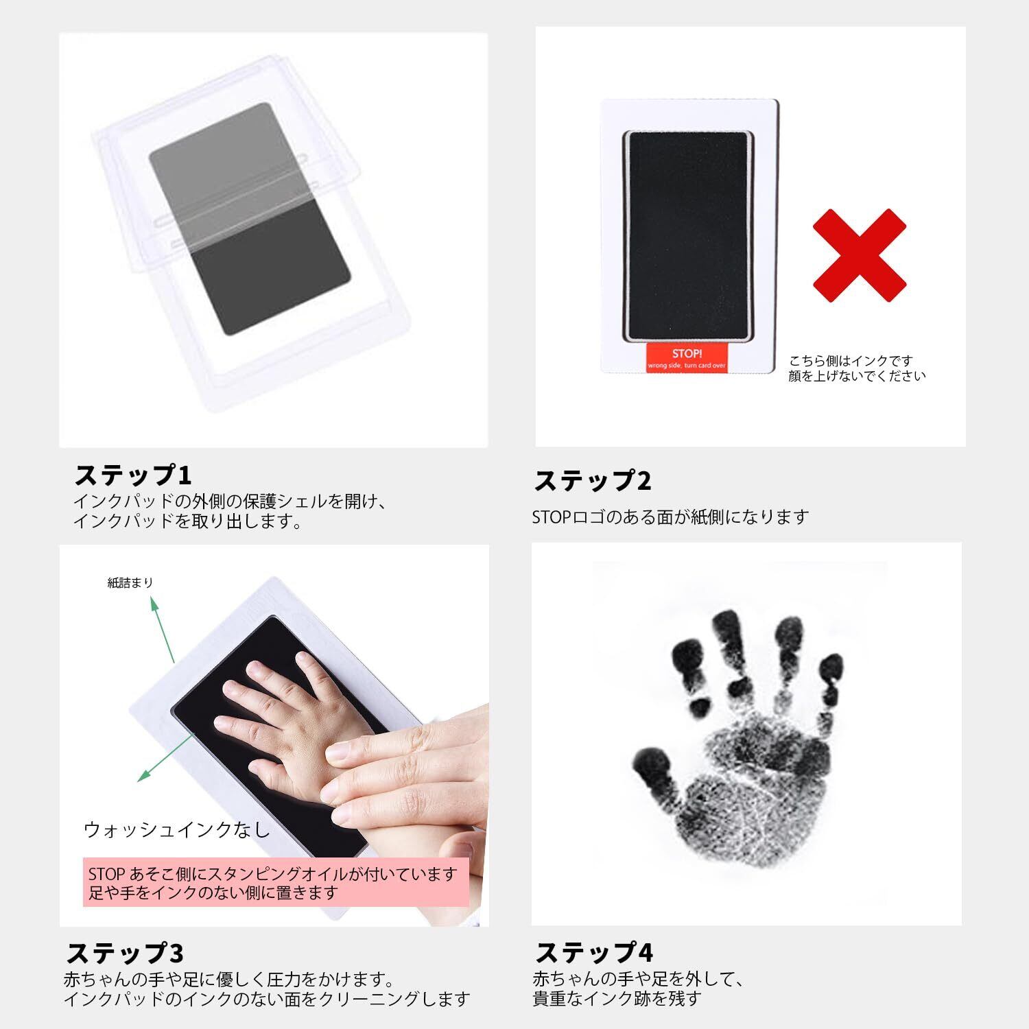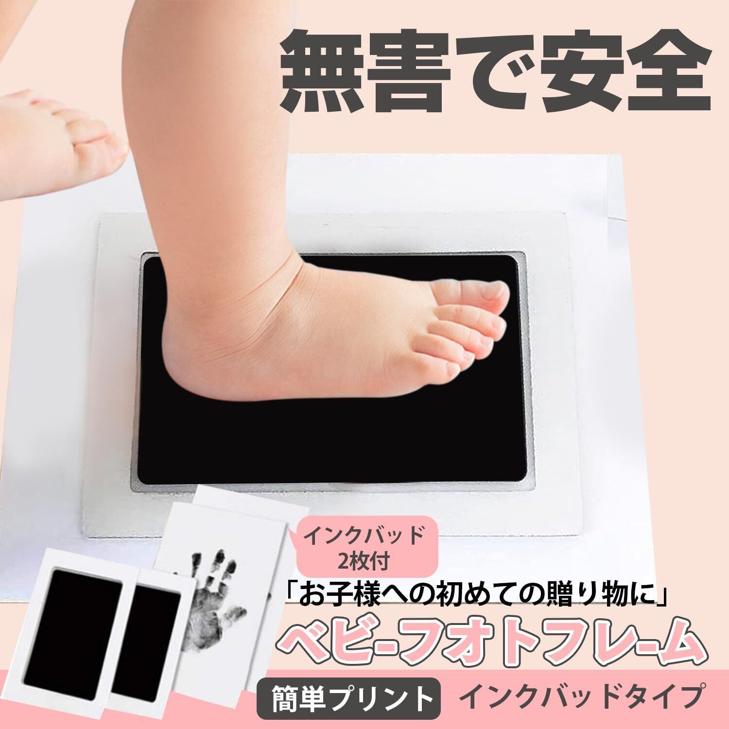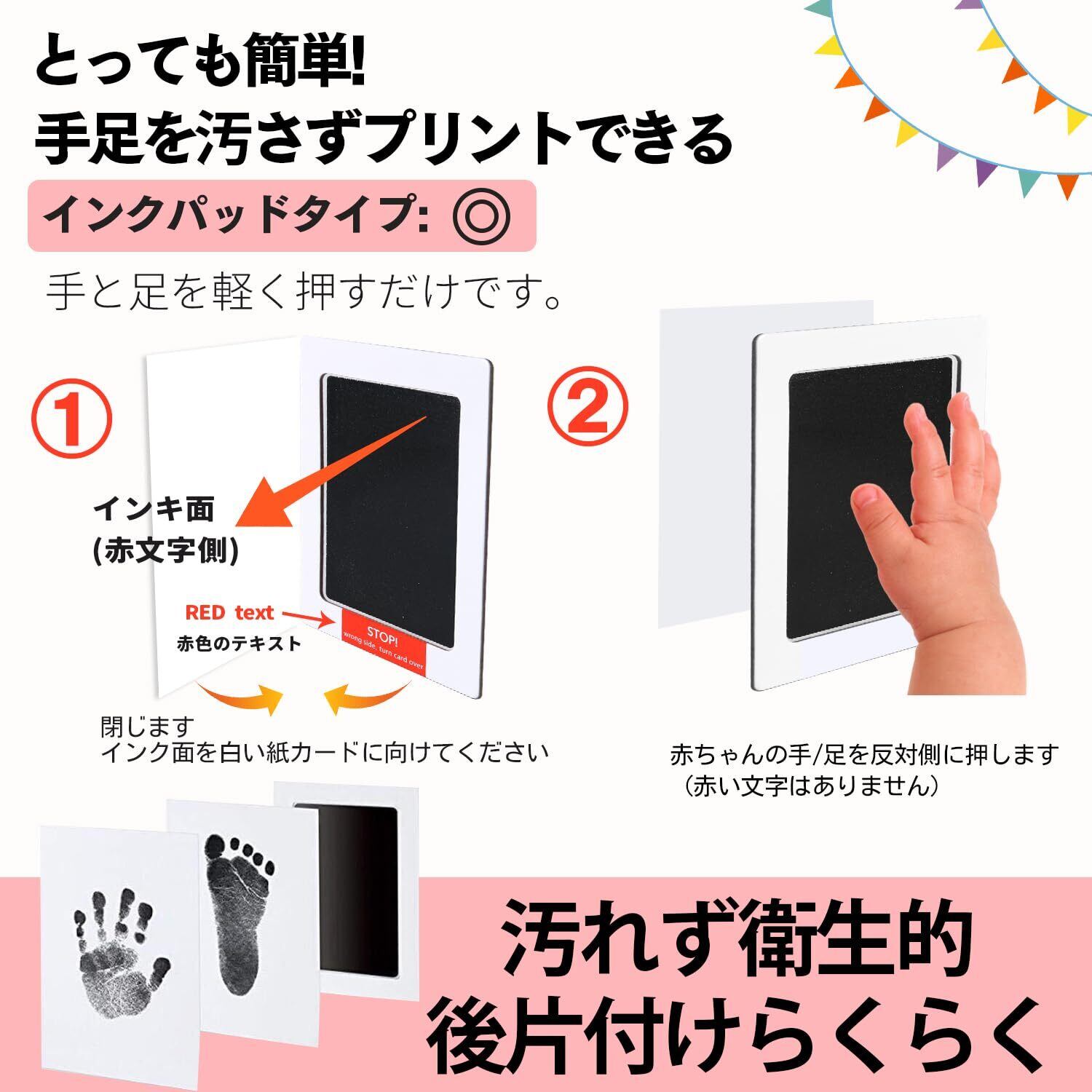 クリーンタッチのインクパッドで、お子さまの手や足に直接インクをつけずに手形や足形をとることができます。