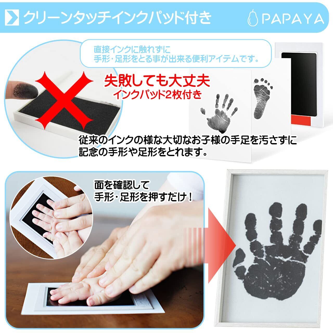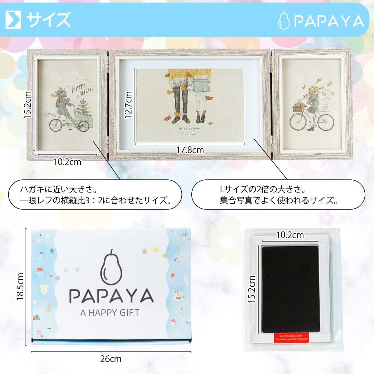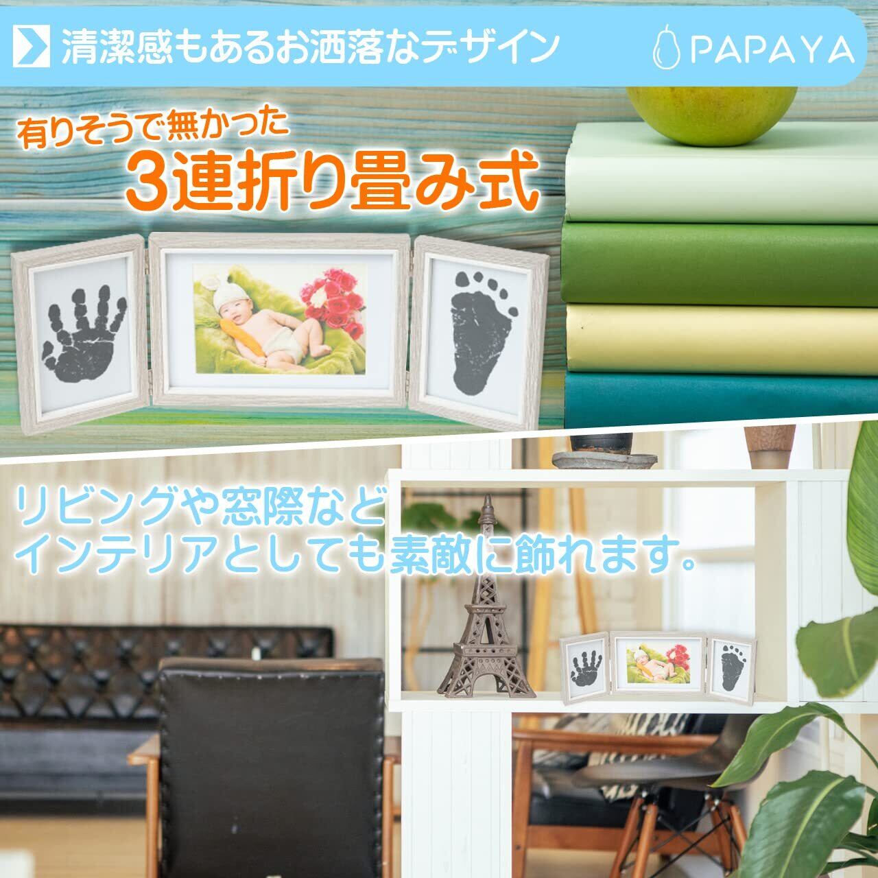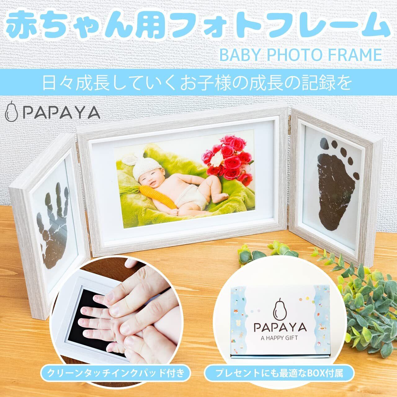 PAPAYA ベビーフォトフレーム手形足形 (3連式 手形 足形 記念品 ギフト 出産祝い 内祝い 写真立て 可愛い化粧箱 赤ちゃん) 失敗しても安心 手足を汚さないインク2枚付き