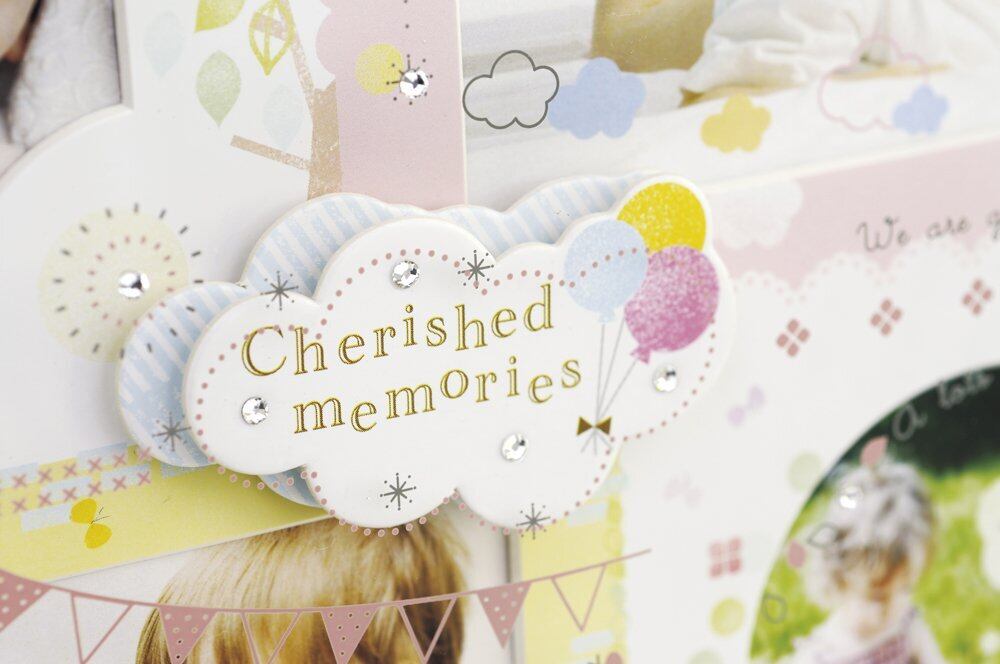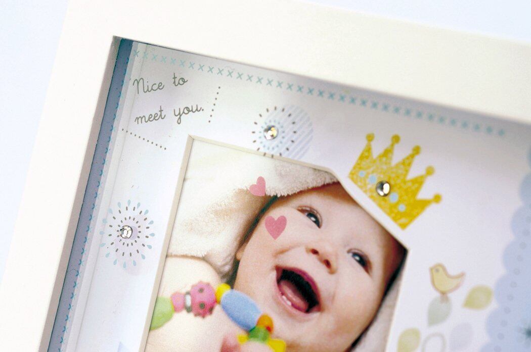 イラスト・ラインストーン・ガラスに施されたプリントが層になり、中に入れる写真を彩ります
