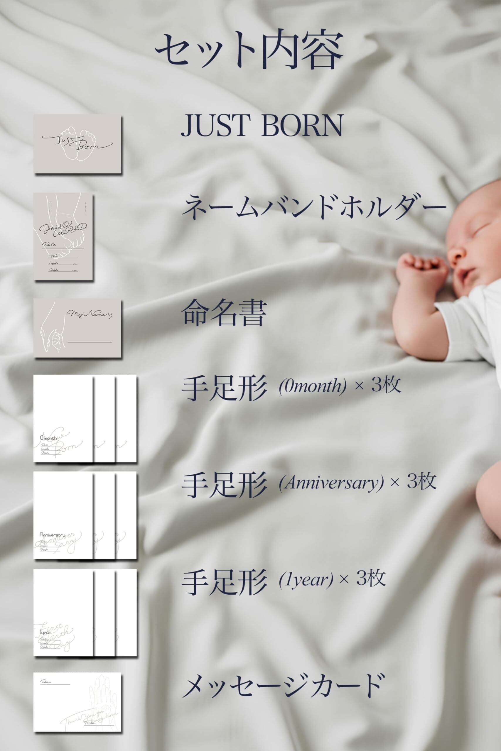 【商品内容】 JUST BORN / 病院タグホルダー / 命名書 / 手足形 3枚*3種類 / メッセージカード1枚 / 全13枚セット