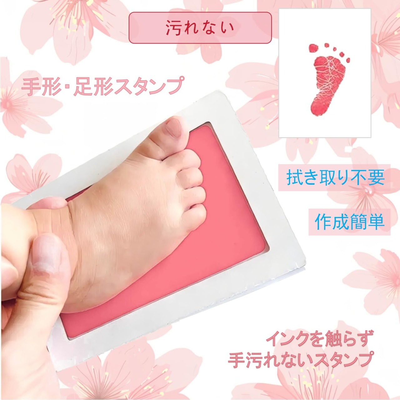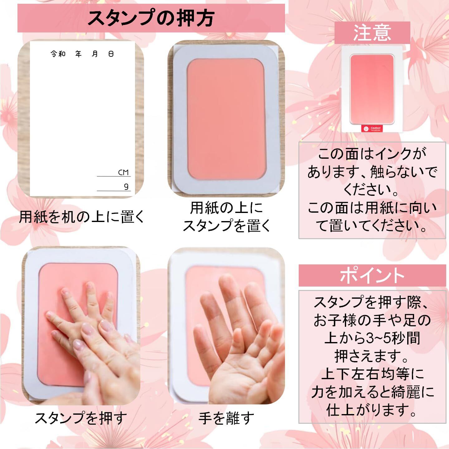 【裏面転写で汚れ0】 予め台紙裏面にインクを配置!手足を表面に押すだけ▶▶ インク直付け不要だから、寝かしつけ直後のタイミングでも安心です。
