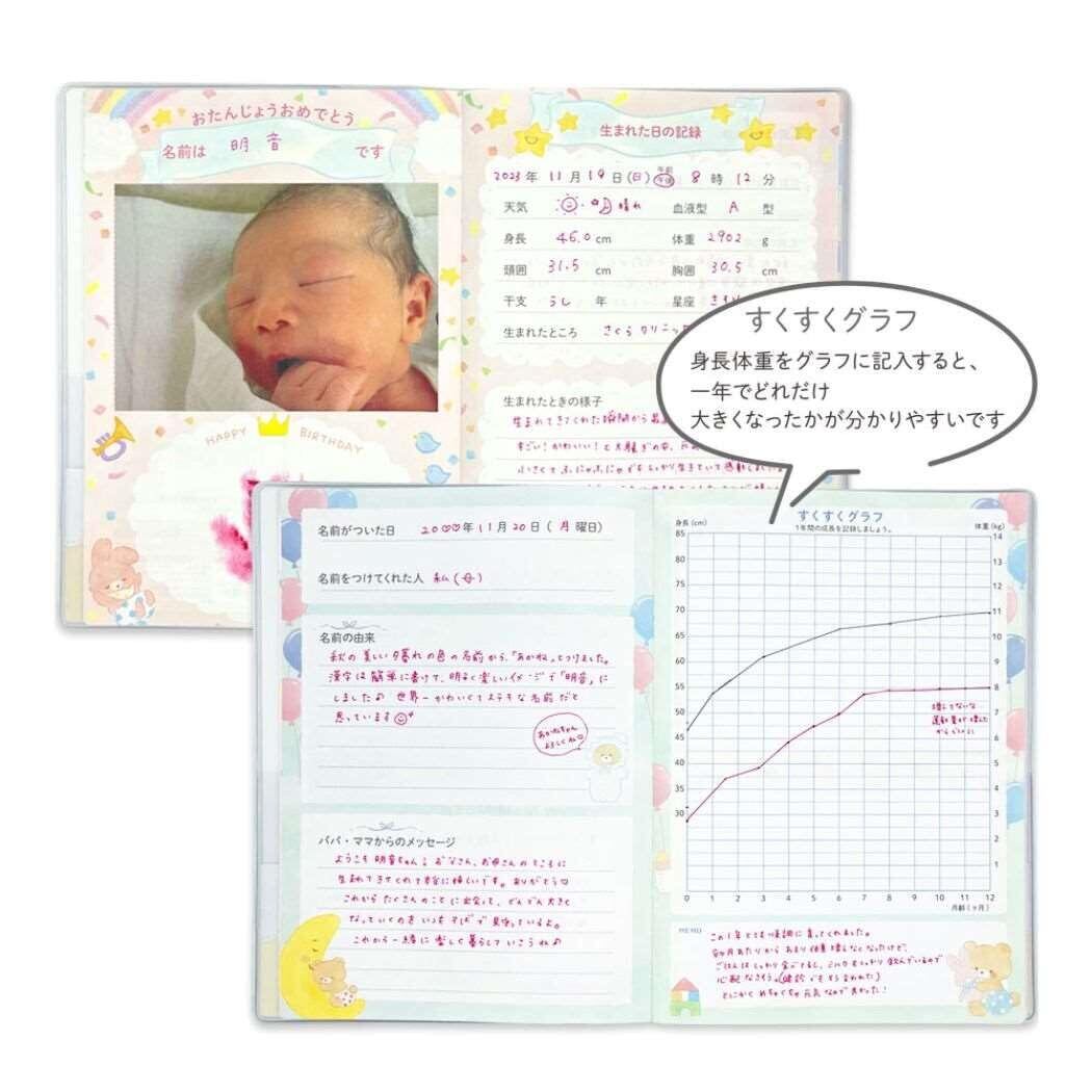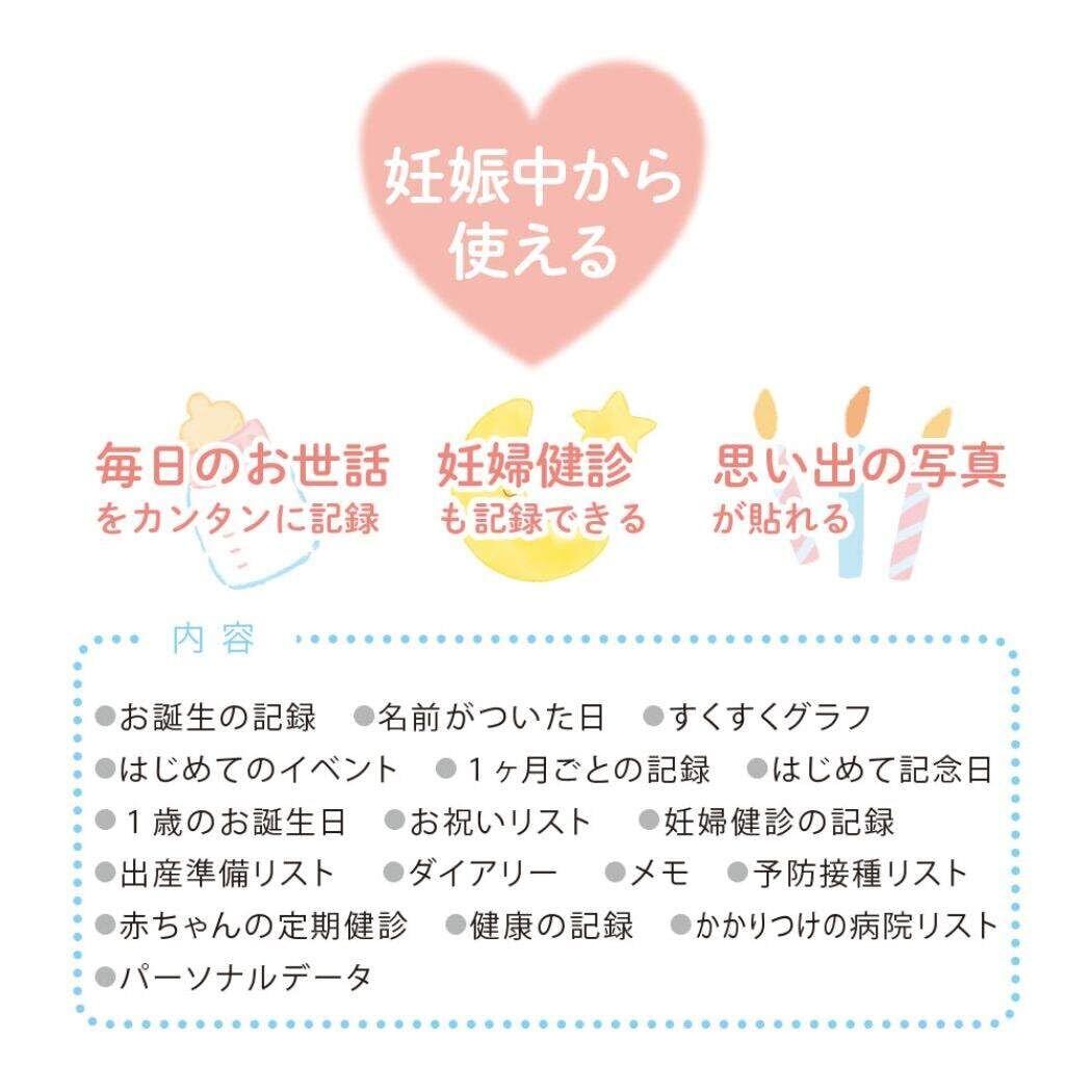 忙しいママにも簡単につけられ、赤ちゃんとの楽しい思い出や写真も残せるお誕生から1歳までのすくすく[育児日記]妊娠中から使えますデザインいろいろあるのでお気に入りを見つけてくださいサイズ:151x216mm(本文144ページ)内容:お誕生の記録/名前がついた日/すくすくグラフ/はじめてのイベント/1ヶ月ごとの記録/はじめて記念日/1歳のお誕生日/お祝いリスト/妊婦健診の記録/出産準備リスト/ダイアリー/メモ/予防接種リスト/赤ちゃんの定期健診/健康の記録/かかりつけの病院リスト/パーソナルデータ