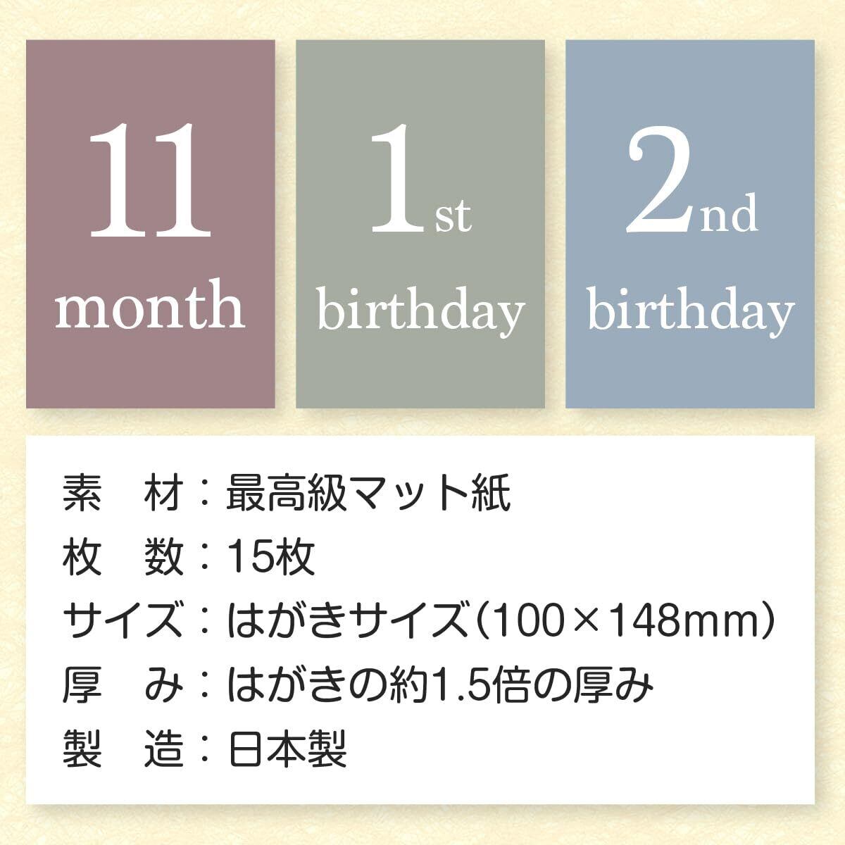 お誕生から1歳までの15枚セット。100×148mm(はがきサイズ)は赤ちゃんの撮影にピッタリのサイズ感。