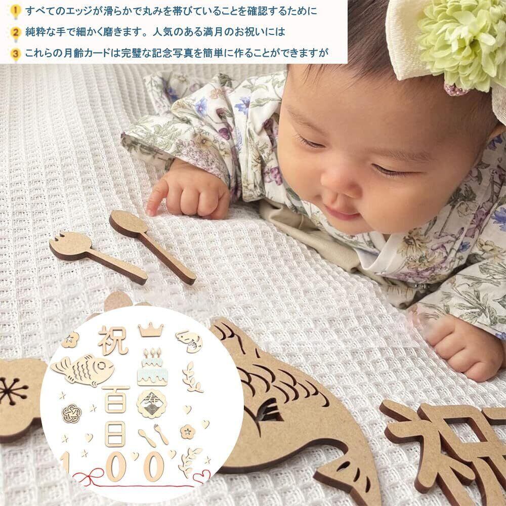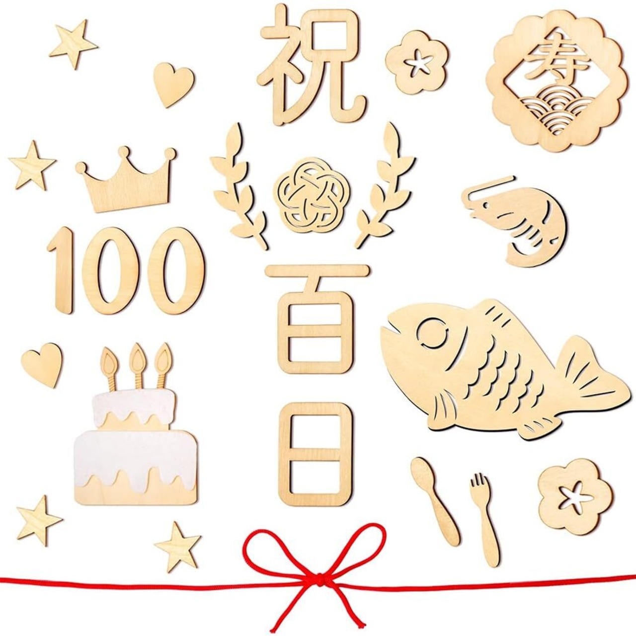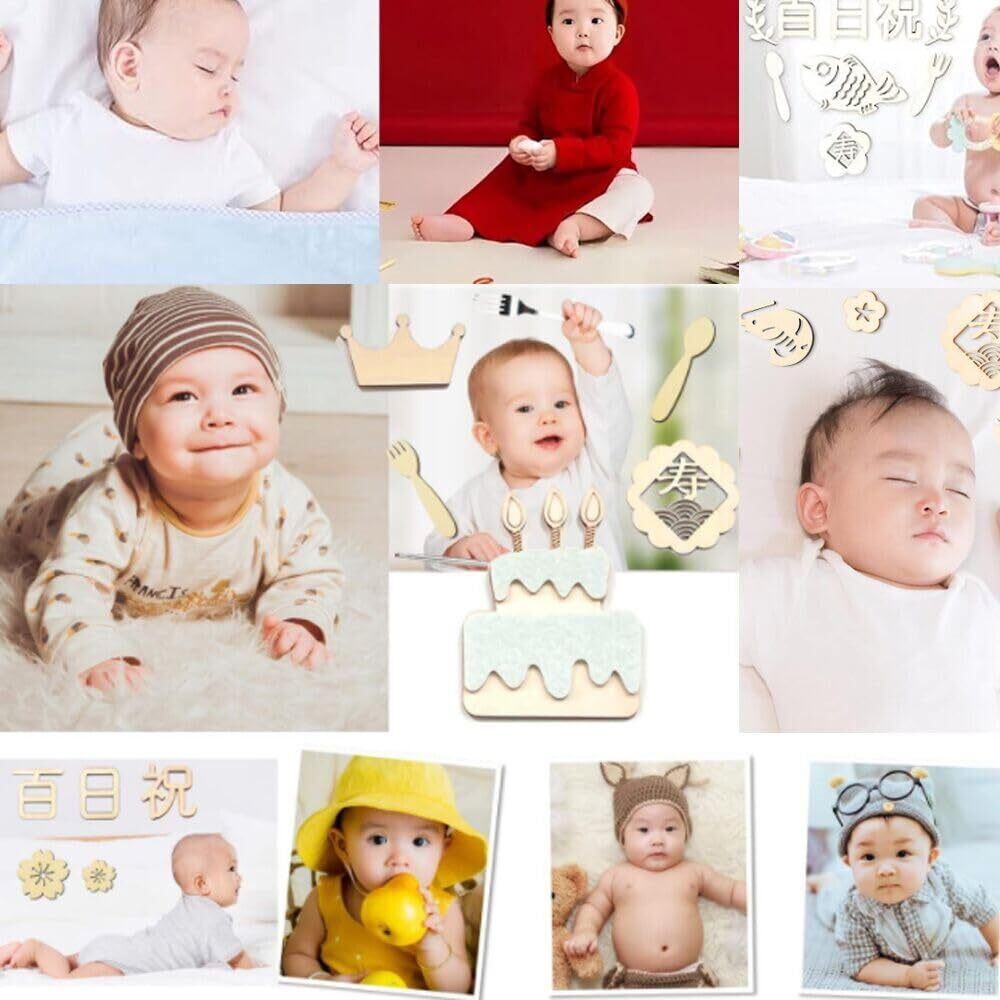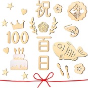 セット内容:百日祝い24枚セット。デザイン:「祝日、百、日」各1枚、「魚」*1枚、「梅結」*1枚、「海老」*1枚、「寿」*1枚、「ケーキ」*1枚、「0」*2枚、「叉」*1枚、「スプーン」**1枚 「心」*2枚、合計2、4枚。 厚さ約3mm。 また、吉祥を象徴する長さ2メートルの赤いひももついています。カラー:木の色。