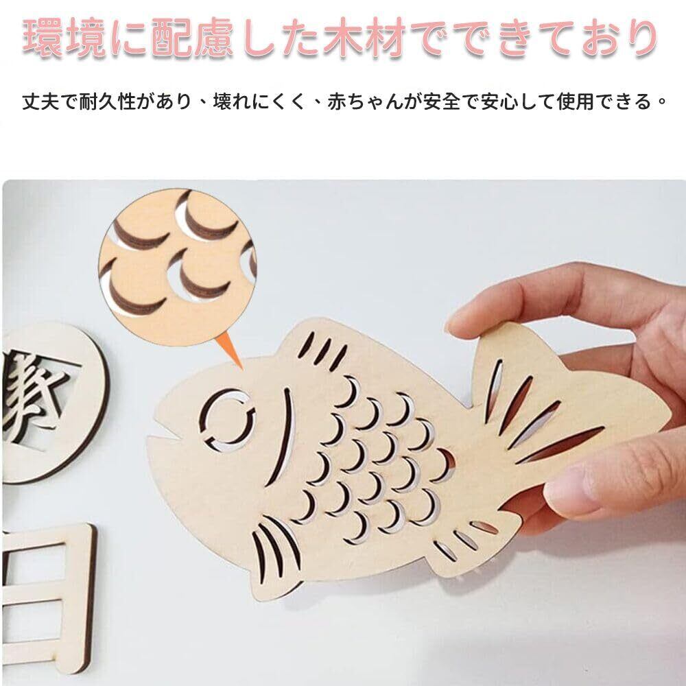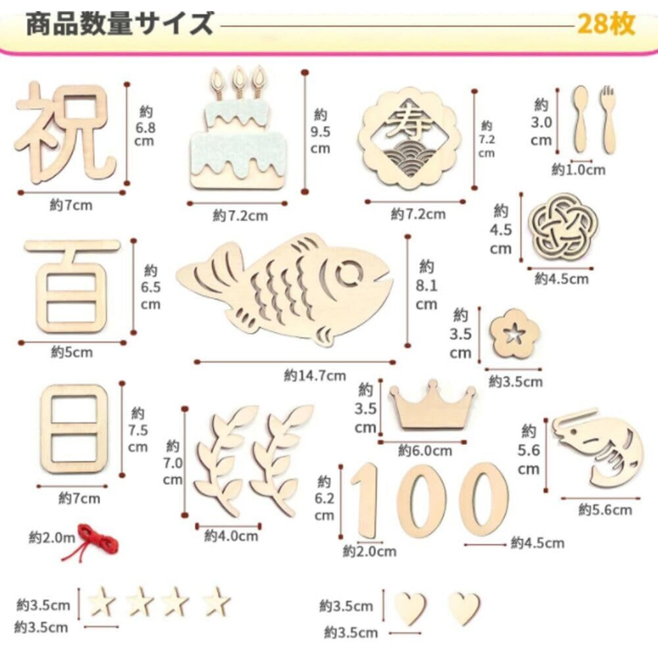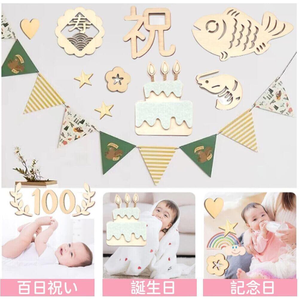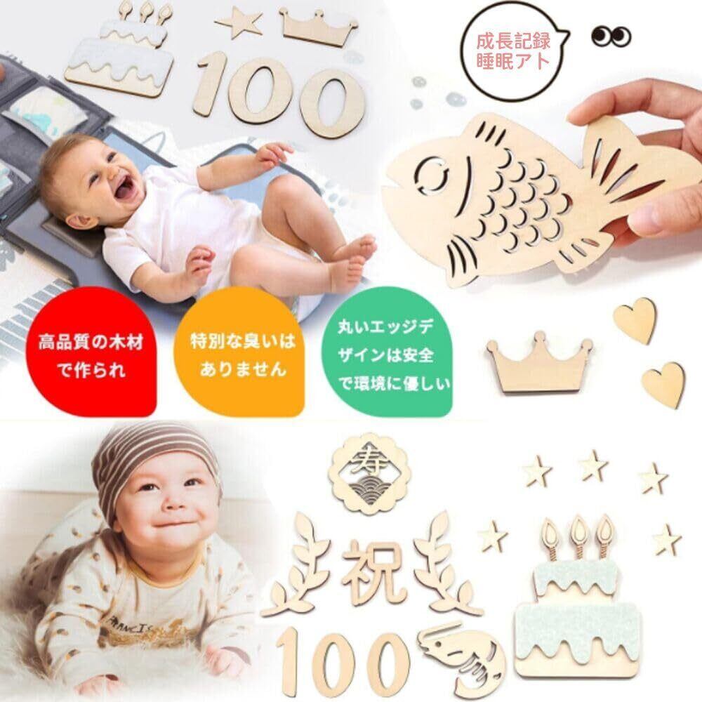 セット内容:百日祝い24枚セット。デザイン:「祝日、百、日」各1枚、「魚」*1枚、「梅結」*1枚、「海老」*1枚、「寿」*1枚、「ケーキ」*1枚、「0」*2枚、「叉」*1枚、「スプーン」**1枚 「心」*2枚、合計2、4枚。 厚さ約3mm。 また、吉祥を象徴する長さ2メートルの赤いひももついています。カラー:木の色。