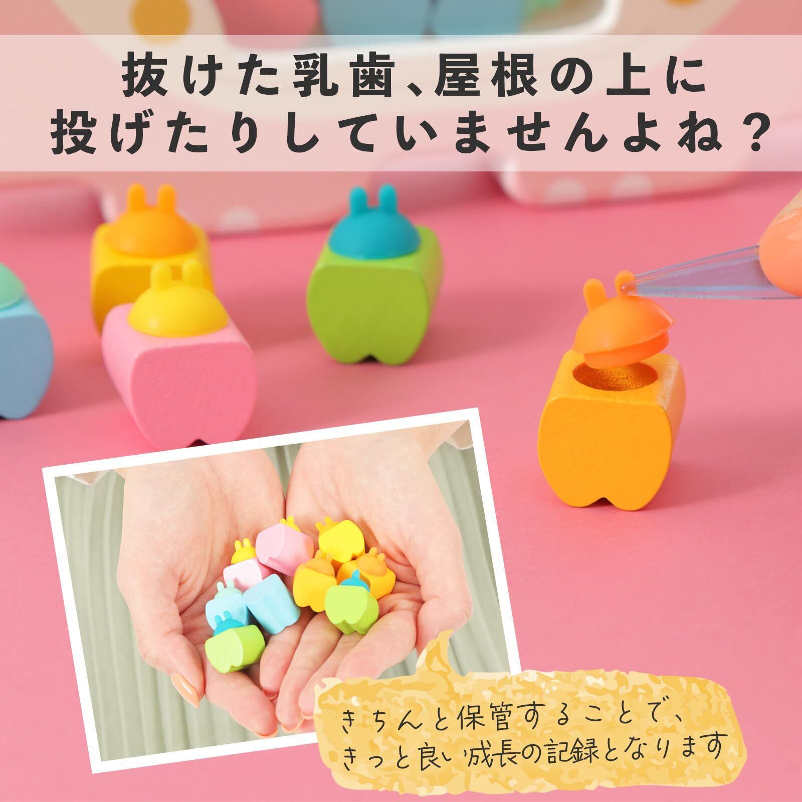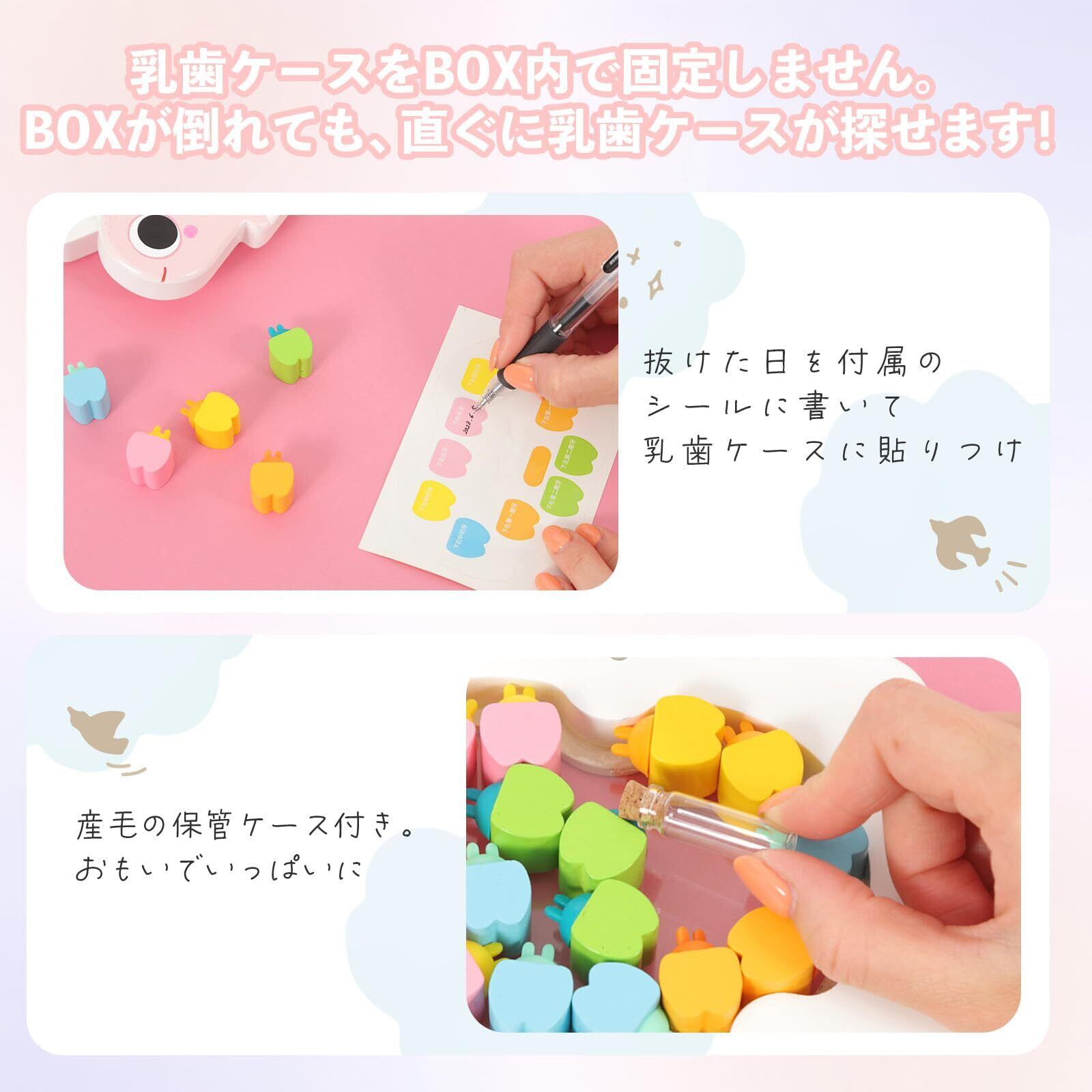 乳歯が抜けた日を記入し、乳歯ケースに貼ることができるステッカーが付いています。さらに、へその緒や髪の毛を保管できるへその緒ケースもセット。日本語の説明書に加え、出産祝いや誕生日にもぴったりなかわいいパッケージ付です。