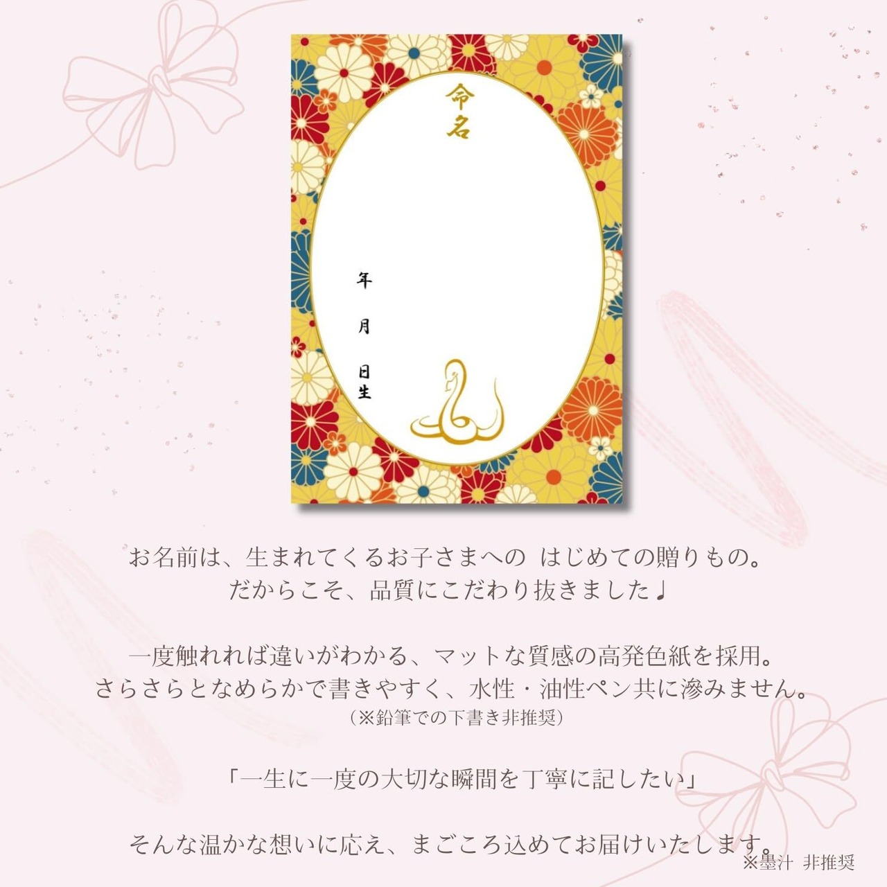 《商品詳細》 ・命名用紙3枚入り ・A4サイズ(210×297mm) ・ 2025年(令和7年)生まれのお子様にぴったりな干支の巳イラスト入りデザイン・高発色で高品質のマット用紙を採用。高発色かつ高品質紙使用のためサラサラとなめらかで書きやすく、水性・油性ペン共に滲みません。(墨汁 非推奨)【ご注意】こちらの用紙は鉛筆と相性がよくないため下書きなどでの鉛筆のご使用は推奨いたしません。こちらの商品はフレームはつきません。 大切な命名紙ですので、ひとつひとつ丁寧な梱包を心がけています。 折れ曲がりを防ぐ厚紙と、透明のOPP袋にお包みして水濡れのないようお届けさせていただきます。プレゼントにも安心してお任せいただける仕様となっています。