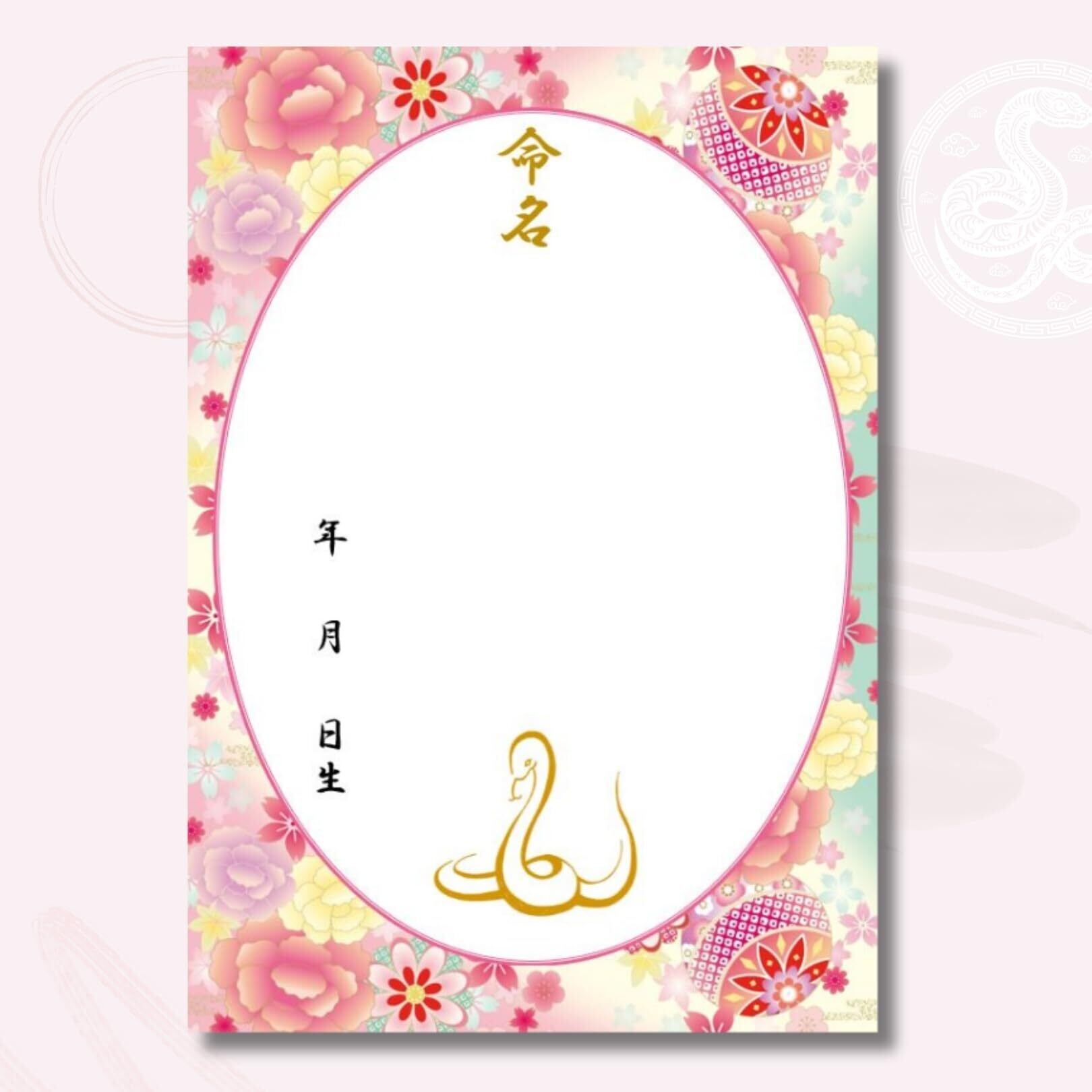 《命名紙3枚セット》毬と牡丹 桃色 令和7年(2025年)干支 巳入り A4和風命名用紙 万が一の書き損じにも安心の3枚入 額なし 優しいパステルカラー 令和7年生まれのお子様にぴったりな干支の蛇入りデザイン 命名書 命名紙 お七夜 出産祝い 命名式 縁起の良い毬と牡丹 ご縁を結ぶリボンが華やかな命名用紙 日本製 MMS110-T