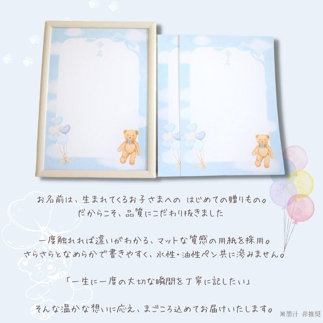 《商品詳細》 ・命名用紙3枚入り ・A4サイズ(210×297mm) ・高発色で高品質のマット用紙を採用。高発色かつ高品質紙使用のためサラサラとなめらかで書きやすく、水性・油性ペン共に滲みません。(墨汁 非推奨)こちらの商品はフレームはつきません。 大切な命名紙ですので、ひとつひとつ丁寧な梱包を心がけています。 折れ曲がりを防ぐ厚紙と、透明のOPP袋にお包みして水濡れのないようお届けさせていただきます。プレゼントにも安心してお任せいただける仕様となっています。