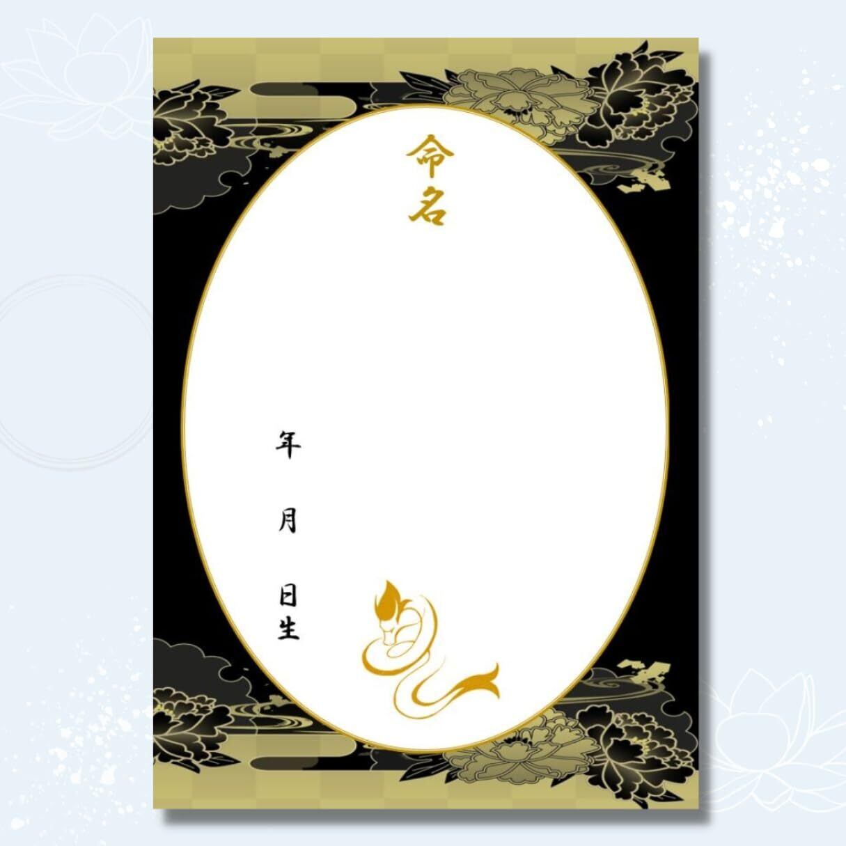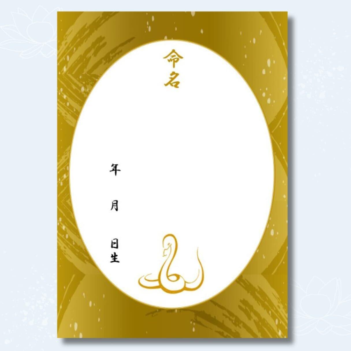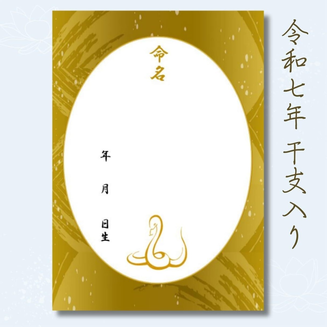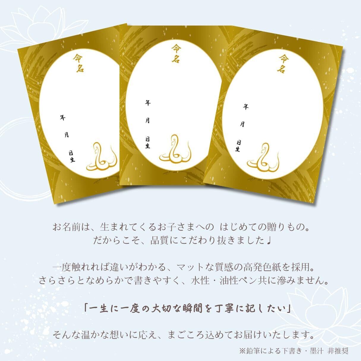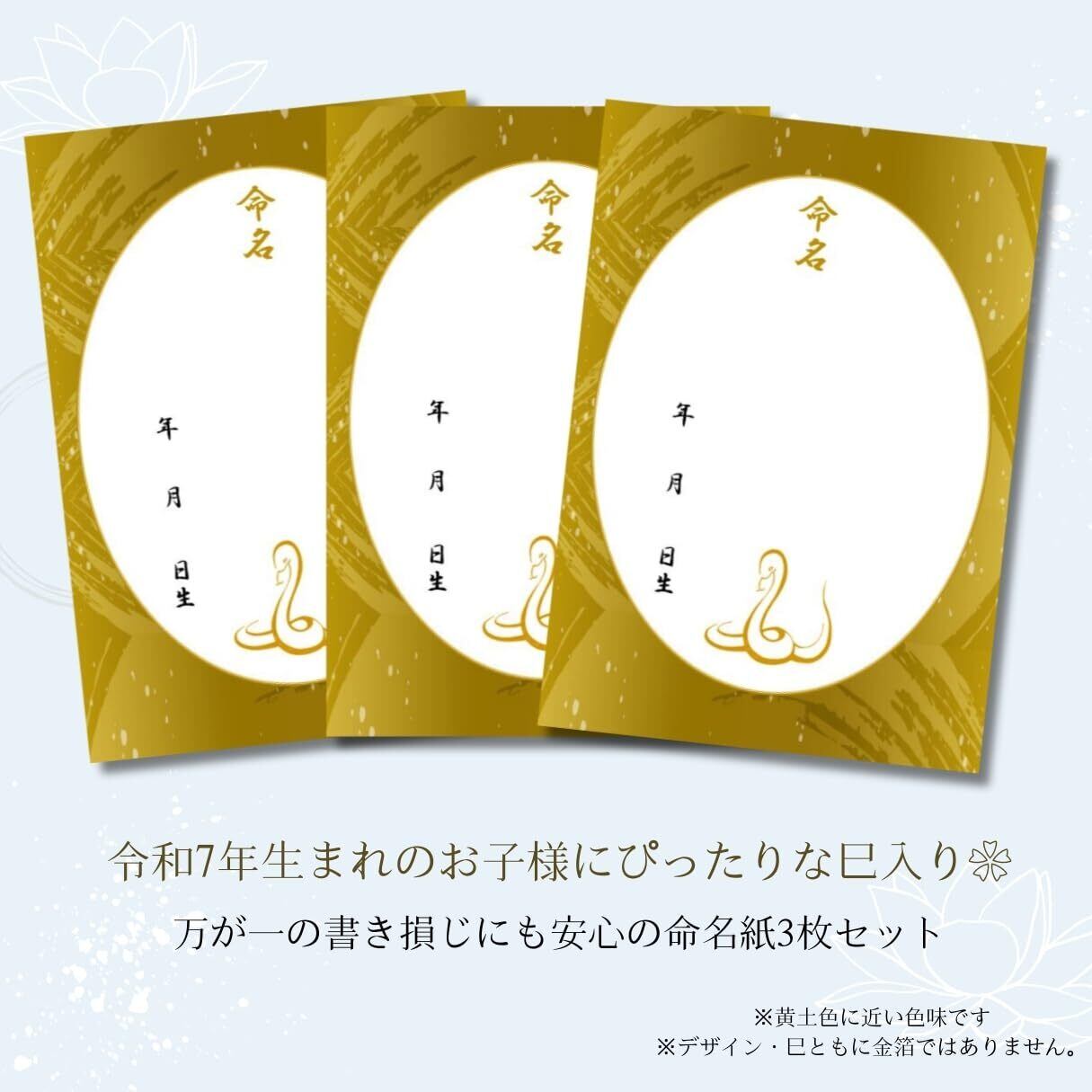 《商品詳細》 ・命名用紙3枚入り ・令和7年(2025年)生まれの巳デザイン・デザイン名が金屏風であり、黄土色に近い色味で金箔ではありません。・A4サイズ(210×297mm) ・高発色で高品質のマット用紙を採用。サラサラとなめらかで書きやすく、水性・油性ペン共に滲みません。(※鉛筆による下書き・墨汁非推奨)こちらの商品はフレームはつきません。 大切な命名紙ですので、ひとつひとつ丁寧な梱包を心がけています。 折れ曲がりを防ぐ厚紙と、透明のOPP袋にお包みして水濡れのないようお届けさせていただきます。プレゼントにも安心してお任せいただける仕様となっています。