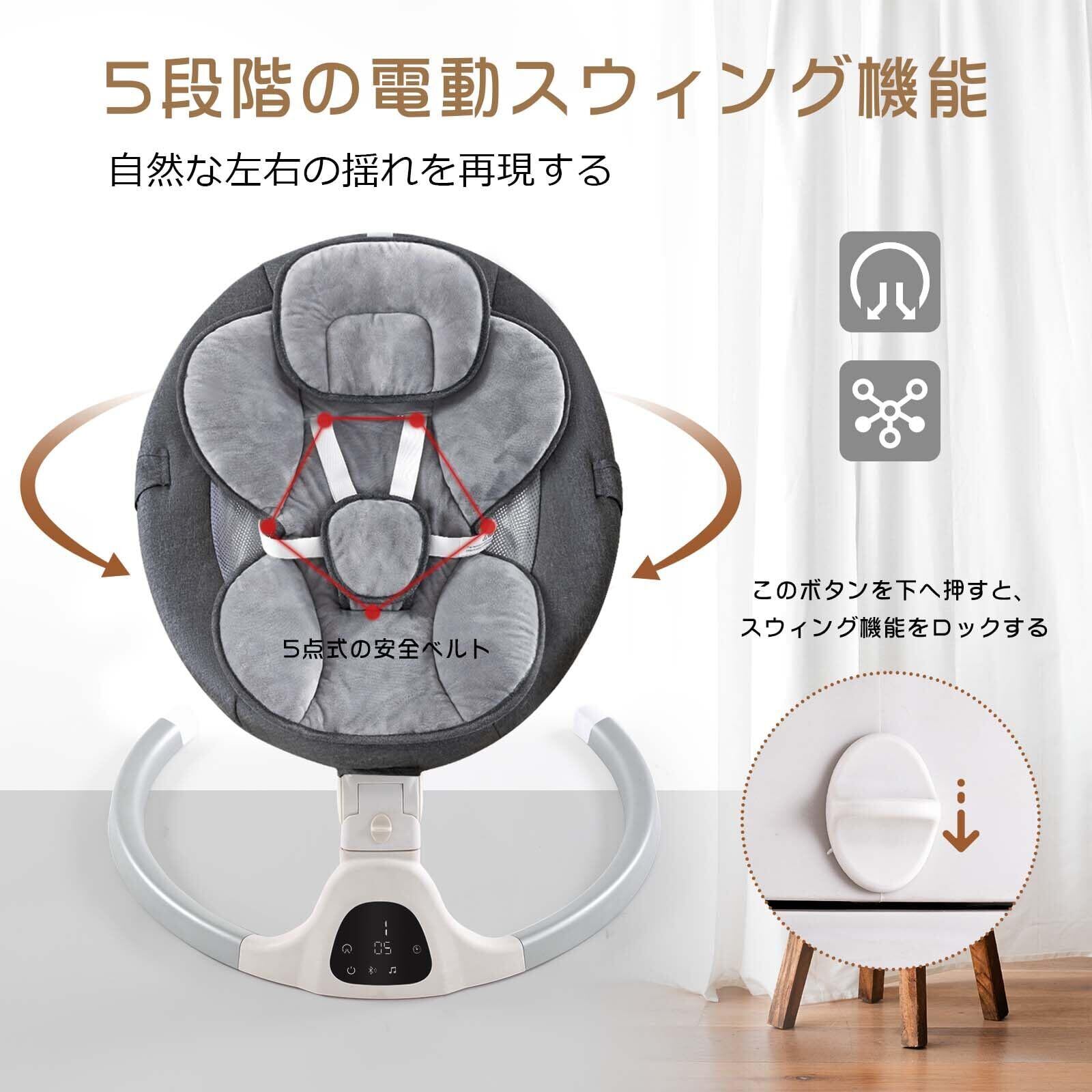 【オートスウィング機能】5段のスウィングスピードを備えており、赤ちゃんの好みに合わせて調整し、最も快適な揺れを実現します。また、赤ちゃんのあんぜんに特に配慮し、両肩・両腰・股下の5点で固定するベルトを採用しており、赤ちゃんを安心にロッキングチェアに乗せることができます。