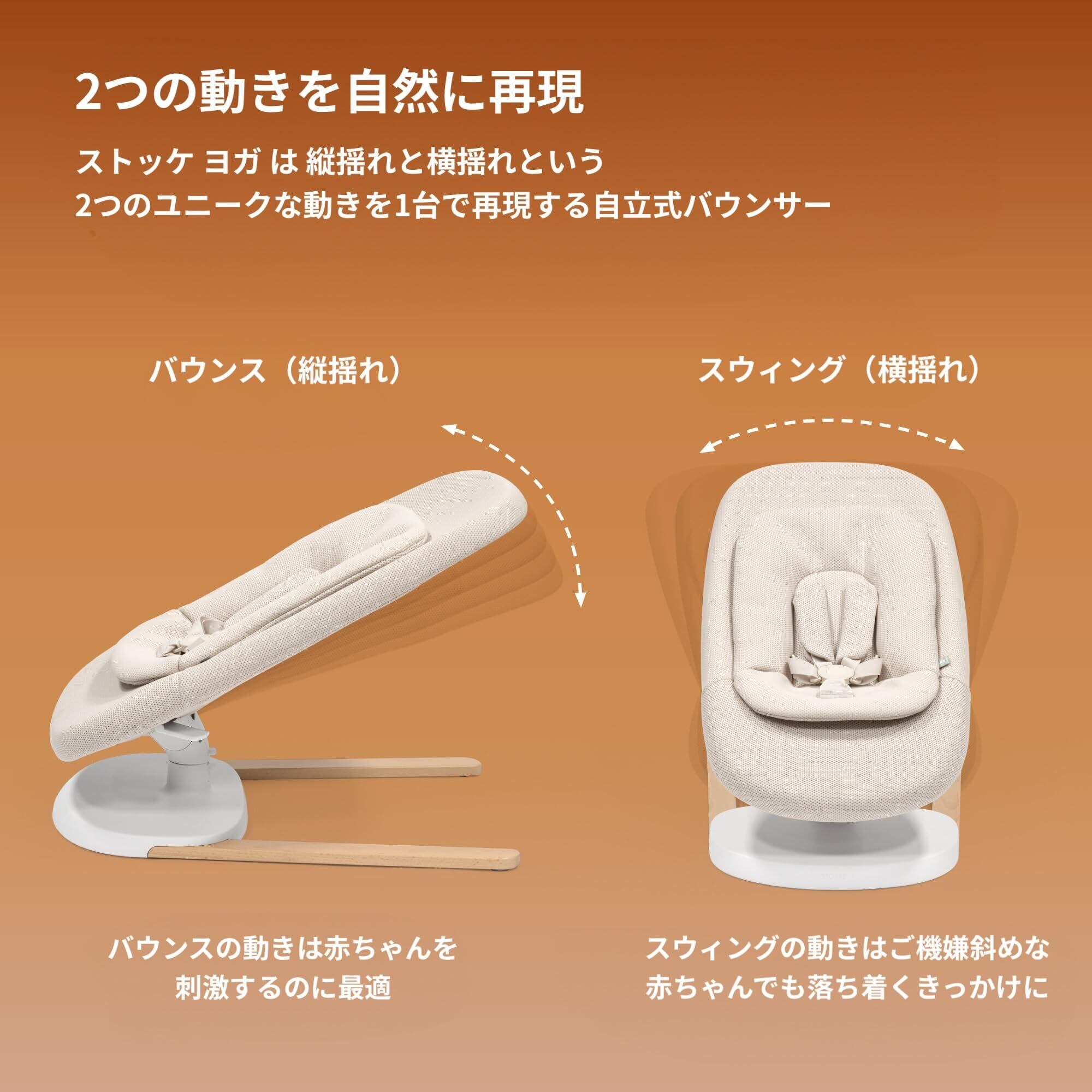 ニコニコ縦揺れと、落ち着く横揺れが台に。 それは、まるで腕の中に包まれているかのよう。 ママ・パパ達が無意識に使い分けている抱っこ。 赤ちゃんの笑顔を引き出す、縦揺れ。 落ち着きを求める時には、優しい横揺れ。 愛に溢れた「バウンス&スウィング」というつの動き。 Stokke® Yoga™は、縦揺れと横揺れという 愛情に満ちたつのユニークな動きを 台で再現する自立式バウンサー。 動きに応じて、赤ちゃんに必要な刺激を与えたり、 心を落ち着かせたりしながら、発達をサポート。 お世話する方の手によっても、赤ちゃん自身の動きによっても、 つの異なる動作をもたらす事ができます。