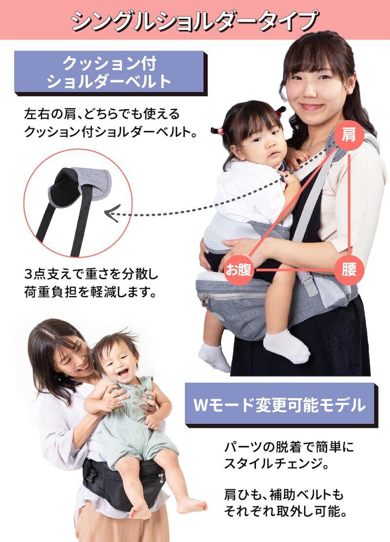 【簡単・便利な子育てグッズ】軽量モデルで持ち運びも楽々、 取り外しも簡単で時間をかけず手軽に使えるベビーキャリアです。抱っこにお困りのママやパパ達もしっかりサポートします。 シートのフロント、サイド部分には収納ポケットを充実させ利便性だけでなく機能性も兼ね備えました。 肩紐は簡単に取り外せ、「ウェストポーチタイプ」とお使い分け出来ますので、家の中やちょっとそこまでの外出から旅行やショッピング、交通移動、送り迎えなど様々なシーンで活躍いたします。お手頃価格なのでキャリアタイプのセカンド用としても大人気のモデルです。