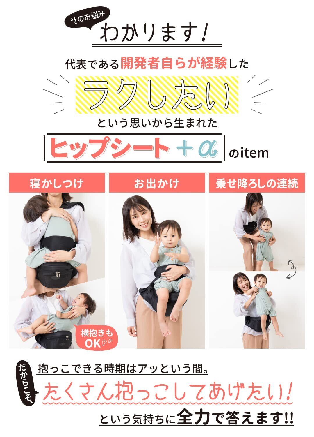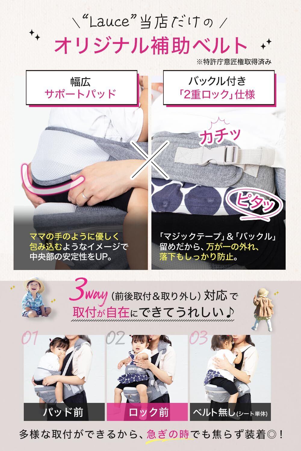 【特徴】本メーカー製品をご購入いただく皆さまの抱っこライフに少しでもお役に立て出来るようイメージ、デザインさせていただきました。 ①優しさパッド付き補助ベルト*パッド付補助ベルトは当ブランドだけ! ②肩紐付き