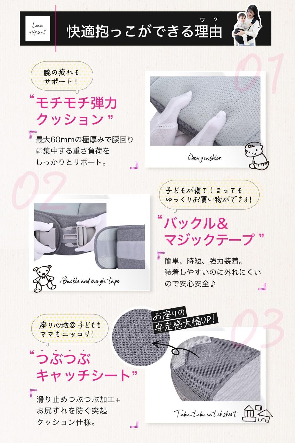 【安全装着構造】腰ベルト部分は、広幅マジックテープとバックル の2重連結構造。また、肩紐・ウェスト紐調整により装着する人に合わせしっかりと固定出来ます。余った紐はくるくるとまとめて留めることが出来るので、赤ちゃんの足へのからまりや、周囲へのひっかかりを気にせずにすっきりと装着出来ます。 《シート座面》厚手骨盤クッションに滑り止め生地を補強することにより、赤ちゃんが座った際のお尻の滑りを軽減。また約35゜の傾斜をつけることにより、ママやパパたちと自然な密着感になり赤ちゃんの心地よい姿勢をキープしながら落下も抑制します。 《シート内部》PP(ポリプロピレン)素材を採用。発泡スチロール素材よりも強度に優れます。しっかりとした安定感でお子様を支えます。
