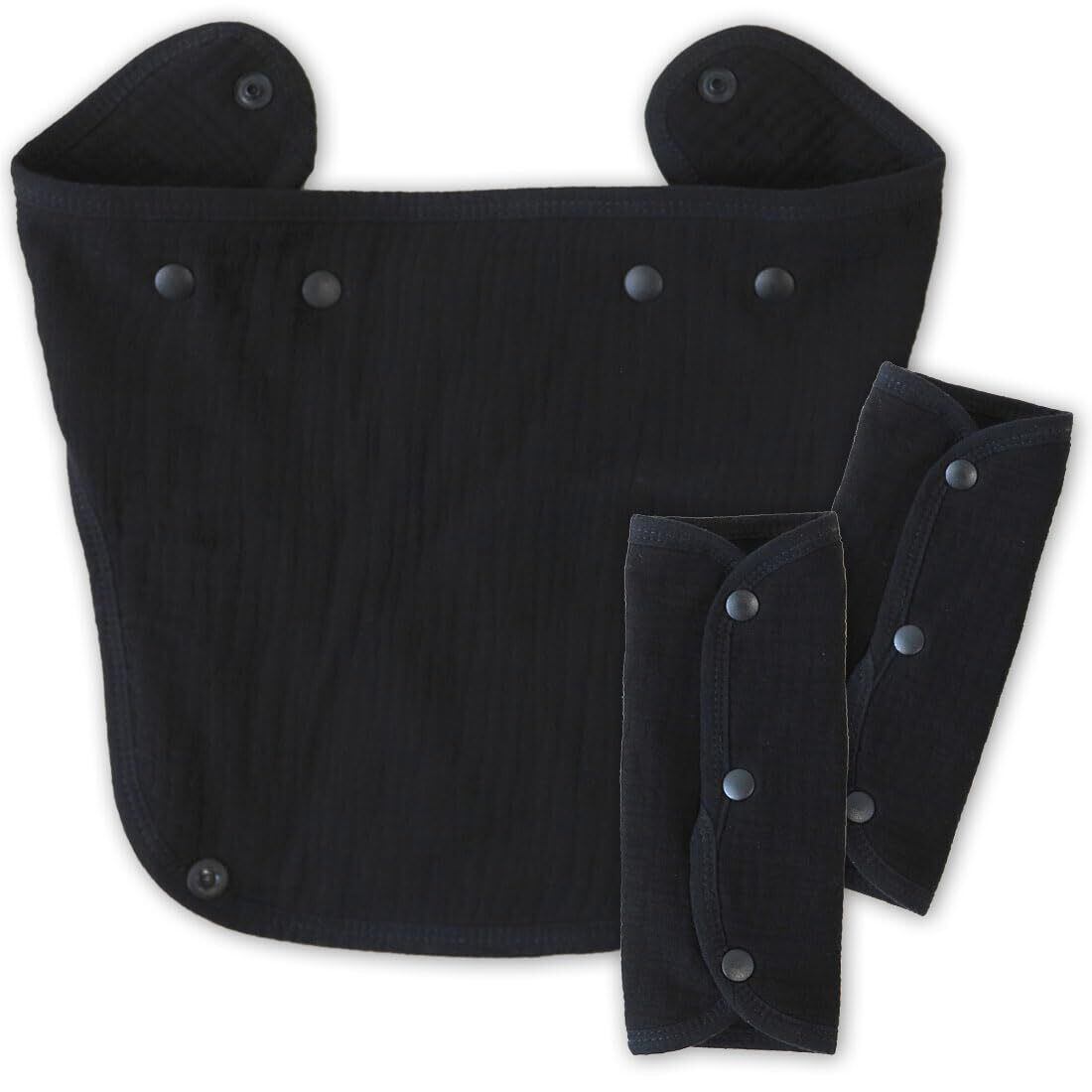 【素材】ガーゼ生地:綿100% / 防水生地:(表地)綿100%(裏地)ポリウレタン加工 【内容セット】ベルトカバー x 2, 胸当て x 1 【サイズ】ベルトカバー(20cm x 20cm) / 胸当て(25cm x 25cm-55cm)