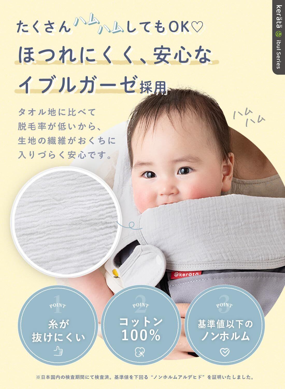【安心・安全のコットン100%】ケラッタのよだれカバーはコットン100%にこだわりました。赤ちゃんが噛んだり・お洗濯をしても、糸のほつれが起きづらいような設計。国内のホルムアルデヒド検査を合格しているので、安心・安全にお使いいただけます。