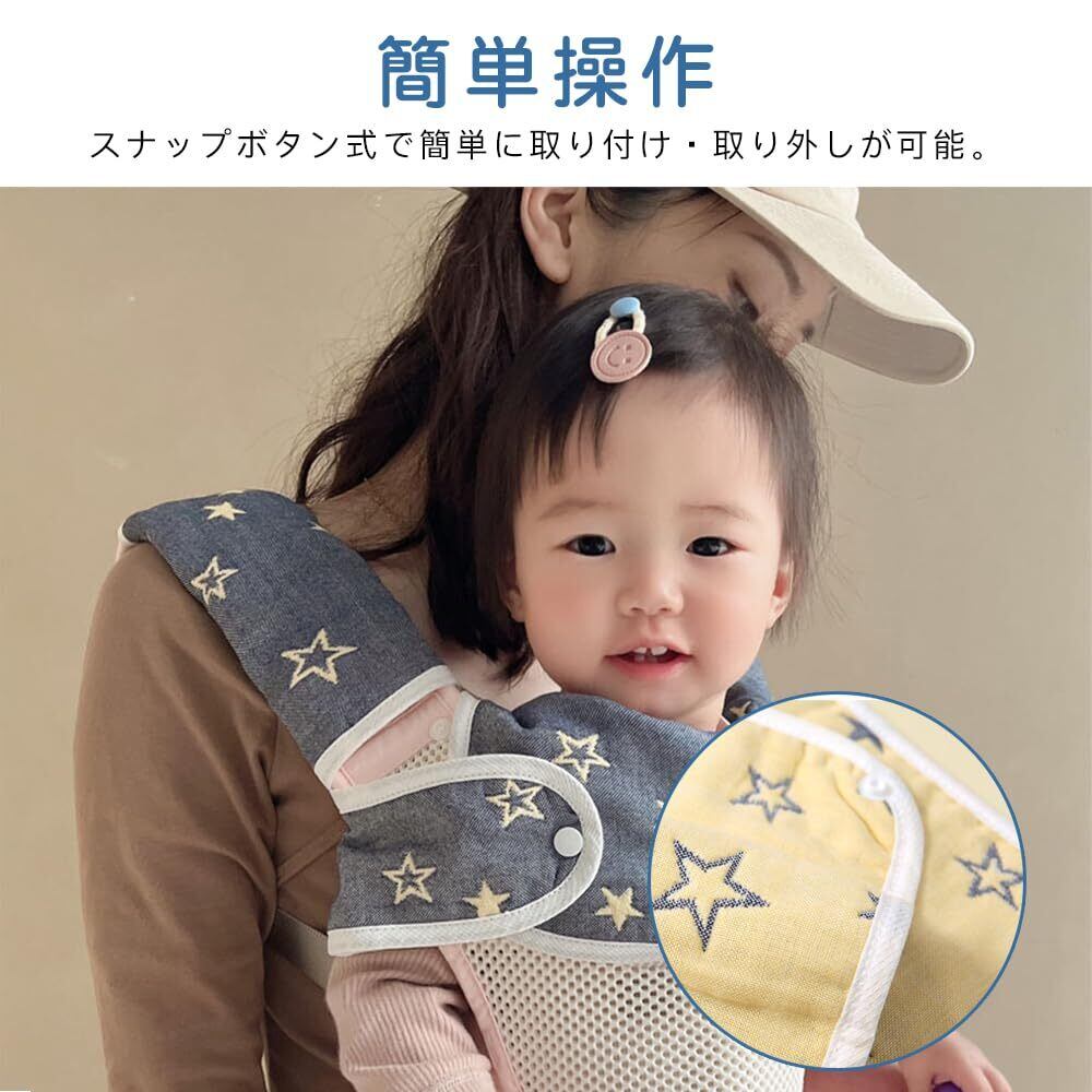 【簡単操作】スナップボタン式で簡単に取り付け・取り外しが可能。忙しい育児中でも手間いらずで、抱っこ紐にサッと装着できます。赤ちゃんが動いてもズレにくいデザインです。