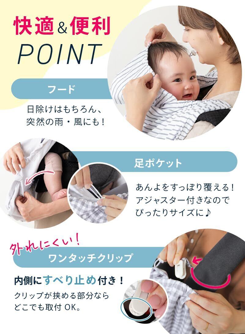 【UVカット生地を採用】 日差しの強い日のお出掛けは紫外線が心配…そんなママでも安心。 ケラッタのUVケープは紫外線をカットする生地を採用。 通気性が高くサラッとした肌ざわりで、暑い日でもムレを気にせず快適に 【簡単取付け】 ケラッタのUVケープはワンタッチクリップでサッと取付けが可能。 様々な種類の抱っこ紐、ベビーカーにカンタンに取付けることができます。 また、クリップの内側には凹凸があり、スベリ止め効果が高く外れにくいので安心です