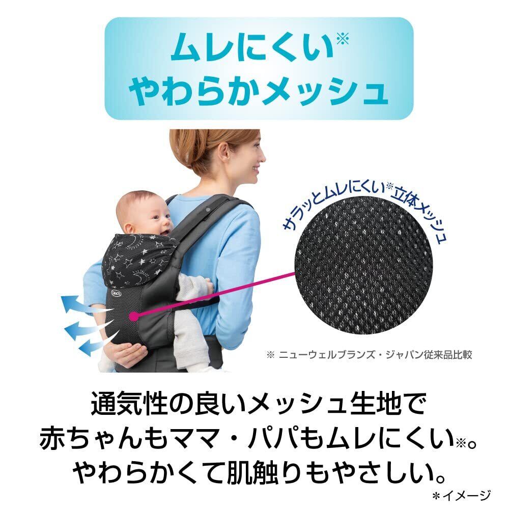 通気性の良いメッシュ生地で赤ちゃんもママ・パパもムレにくい。やわらかくて肌ざわりもやさしい。