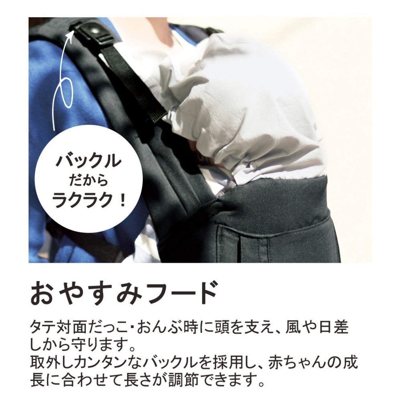 フードバックルで簡単に取り外しでき、フードベルトで赤ちゃんの成長に合わせた長さ調節が可能です。