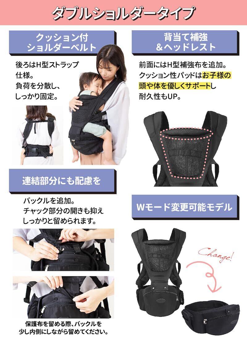 【商品仕様】こなれ感を演出しながら、様々なシーンやファッションコーデに合わせられる「定番ブラックカラー」。肩パッドは上衣を羽織っても出来るだけ浮き上がらないよう出来るだけオシャレの邪魔にならないよう設計しております。 性別や年齢問わず長くご使用いただけるモデルとなっております。 《各種認証規格》ホルムアルデヒド検査合格。国際安全基準(ASTM)合格。耐荷重検査合格(使用体重は20kgまでですがより余裕をもった30kgの試験に合格しました) 《商品仕様》ウエスト目安:約65cm〜115cm 推奨対象年齢:約3か月〜36ヶ月頃 体重:20kgまで ※赤ちゃんの成長過程やご使用の頻度によっては個人差がございます 商品の品質・検品には万全を期しておりますが、万が一製品に不具合や気になる点などございましたら、お気軽にお申しつけください。速やかに交換・返品を承ります。スタッフ一同誠心誠意真心を込めてご対応をさせていただきます。