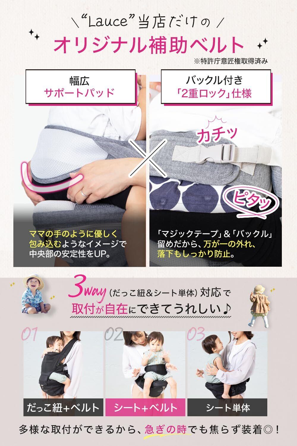 ヒップシート 抱っこ紐 【小児科&保育士W推薦】 補助ベルト付き ヘッドレスト シート 収納 ベビーキャリア おんぶ紐 赤ちゃん 20kg ラウチェ 日本語説明書付き (ブラック)